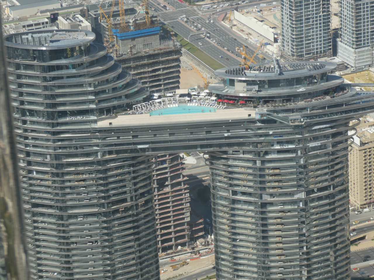 Eigentlich hatte ich mir etwas anderes vorgestellt, nämlich auf Schwimmbadhöhe über eine offene Brücke zu gehen, statt dessen mussten wir vier Stockwerke tiefer über die Bridge laufen. Wer wollte, konnte natürlich über den 46 Meter langen Glasboden gehen, und 200 Meter in die Tiefe zu schauen.