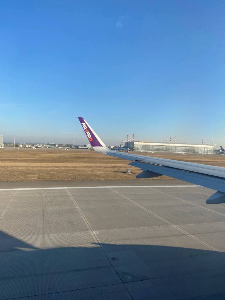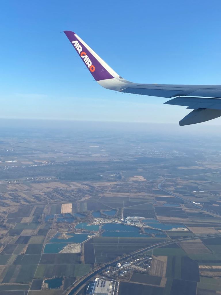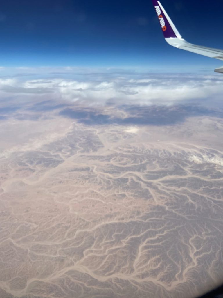 In Modul A befinden sich einige Sitzbänke auf denen wir Platz nehmen um unser entgangenes Frühstück nachzuholen. Anschließend gehen wir auf einer Treppe ein Stockwerk tiefer um über das Rollband hinüber nach Modul B zu fahren wo sich die Pass und Handgepäck sowie die Personenkontrolle befindet. Kurz nach 7:00 kommen wir durch die Kontrolle in den Sicherheitsbereich, wo wir weitere 40 Minuten warten müssen, bis wir in den Flieger von Air Kairo mit der Flugnummer (SM2931) steigen. Unser Flugzeug ist eine Airbus A320-200 neo mit 180 Sitzplätzen. Die Sitzreihe ist ziemlich weit hinten, aber dafür haben wir einen Fensterplatz bekommen. Unser Flieger setzt sich kurz nach 8:00 in Bewegung und wenige Minuten später um 8:14 sind wir schon in der Luft. Unsere Flugroute verrät der Flugkapitän leider nicht, so dass wir auf`s Raten angewiesen sind.