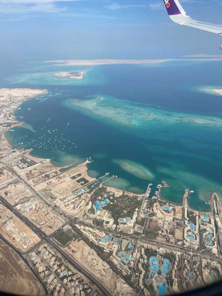 Wir kommen dann auf der linken Seite an der Hauptstadt Kairo vorbei, es geht weiter durch die Lybische bzw. die Arabische Wüste wo die Sicht heute nicht allzu gut ist. Bis wir dann kurz vor 12:00 erstmals das Rote Meer unter uns sehen können. Wir fliegen in einem Bogen von der Meerseite und von Süden den Flughafen von Hurghada an.