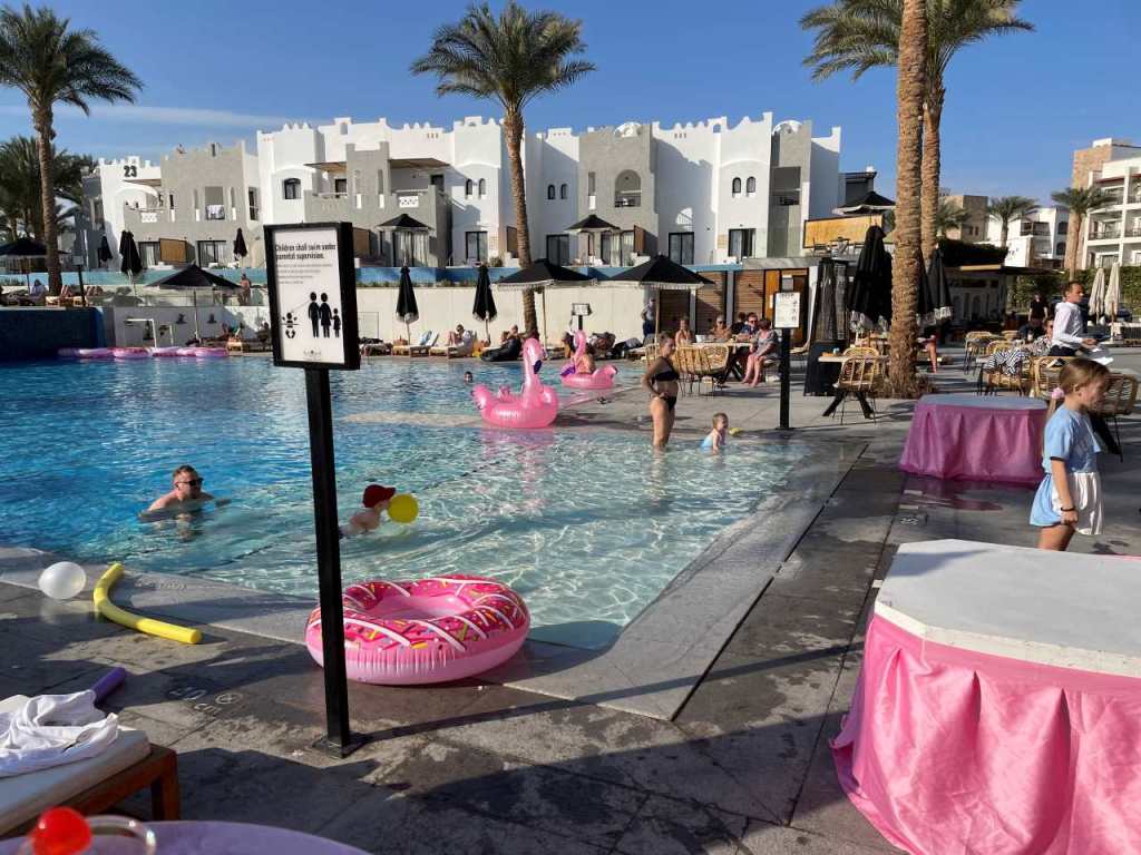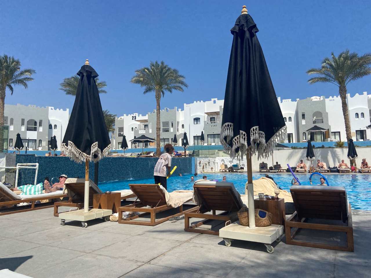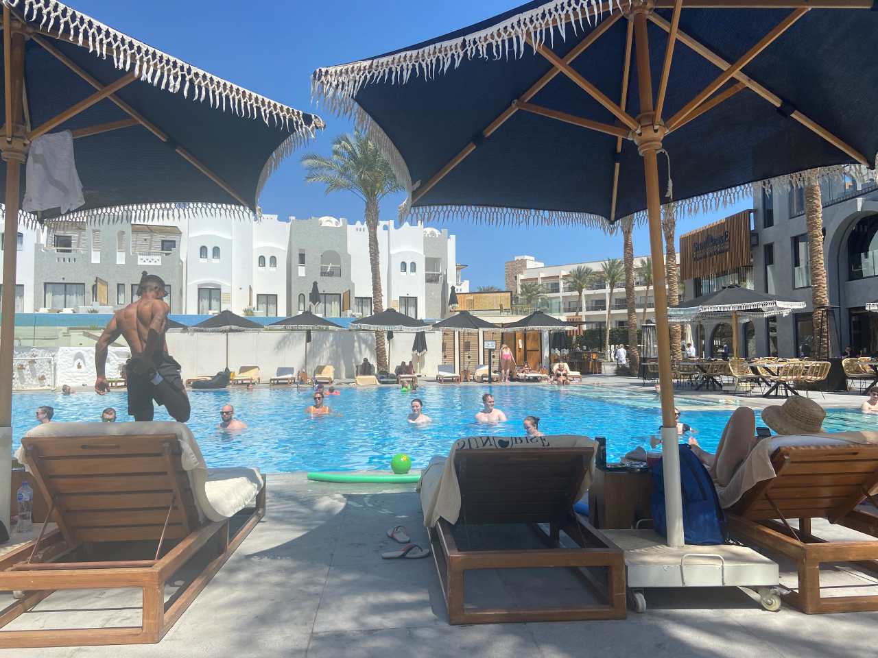 Heute Morgen ist keine Wassergymnastik hier am Pool, vor ein paar Tagen hat eine Animateurin direkt vor unseren Augen eine abgehalten. Sie ist zierlich aber unheimlich agil und quirlig. Wie wir in einem späteren Gespräch mit Ihr erfahren stammt sie aus Assuan.
