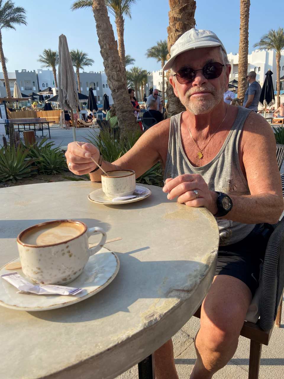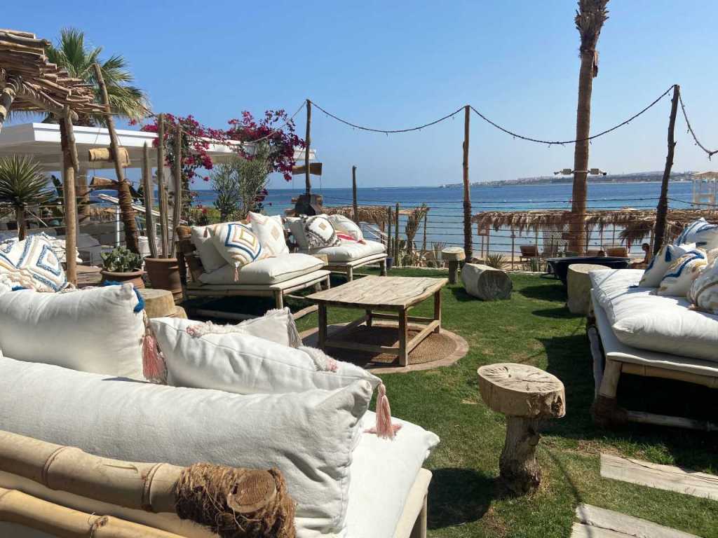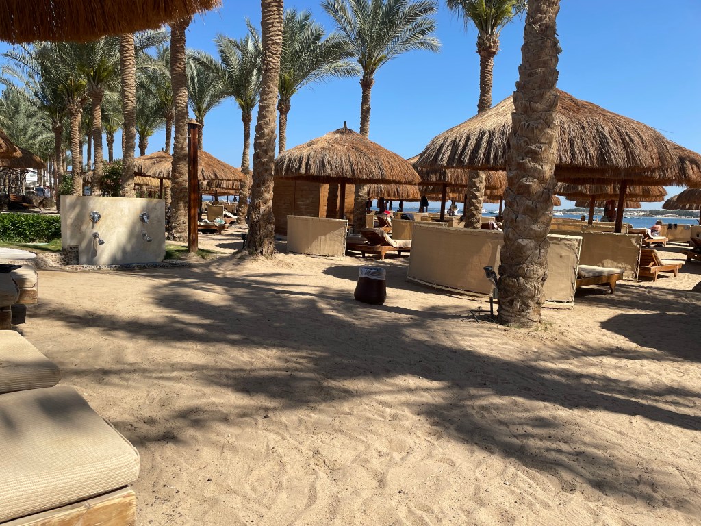 Wir haben eine freie Badeliege in der Nähe des Lifeguard der den unteren Pool überwacht, gefunden. Ich gehe zur Oasis Bar hinüber um an der Theke einen Strawberry Juice zu bestellen. Dieses Jahr haben wir einen Poolboy der nicht unbedingt zu allen Badeliegen geht. Aber er bringt dann wenigstens die bestellten Getränke. Heute Morgen ist Wassergymnastik am Pool, einer der Animateure, meiner Optischen Einschätzung kommt er aus Nubien, mit einem Muskulösem Oberkörper macht die Übung heute. Gegen 11:00 packen wir unsere Badesachen und gehen zum Strand hinunter. Wie erwartet finden wir noch einen Liegeplatz in der letzten Reihe direkt an der Chiringuito Bar (Strandbar), wo sich auch die Handtuchausgabe bzw. die Toilette befindet. Kurz vor Mittag ziehen wir unsere Strandschuhe an und machen uns auf den Weg in Richtung der Red Seas Hotels, wo wir gute Erinnerung an sie haben. Es ist merkbar wärmer geworden, jeder Tag ein bisschen mehr. Unser Weg geht die lange Promenade vom Arabesque entlang, es ist ein schöner Weg und grüne Wiesen, ob das Hotel auch so toll ist können wir leider nicht beurteilen.