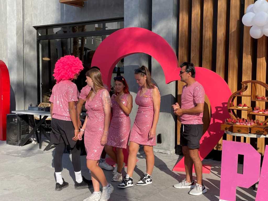 Vor dem Zentralgebäude wo sich Rezeption bzw. dem Lucina Restaurant findet eine Animationsveranstaltung statt, auf zwei kleinen Podesten tanzt immer ein Animations-Pärchen. Im Hintergrund an der Wand stehen auf einer Anrichte Gläser mit bunten Getränken und sind kleine Schalen mit Erdbeeren aufgestellt. Es ist offensichtlich die gleiche Veranstaltung die wir am letzten Samstag als wir angekommen sind erlebt haben.