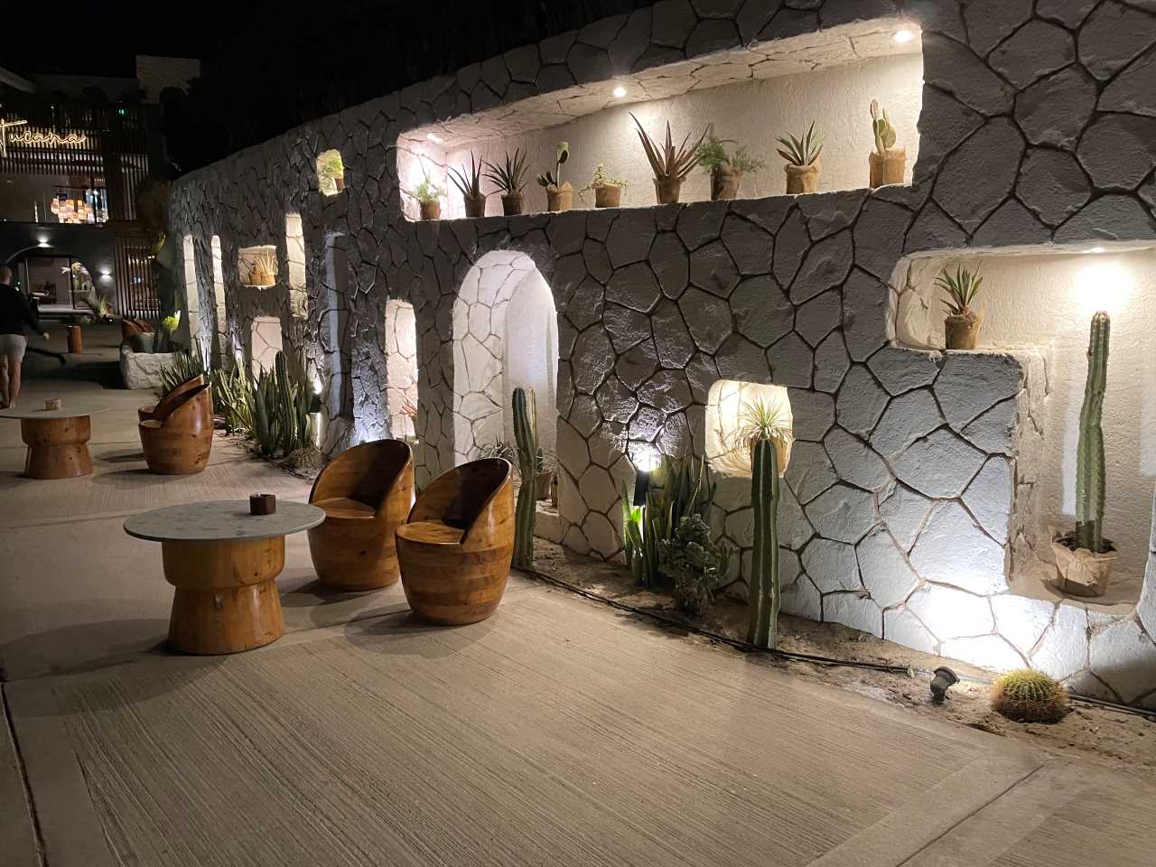 Danach setzen wir uns auf eine der Bänke an der Mauer mit ihrem schönen Mexikanischen Stil die mit vielen Blumennischen versehen ist. Auch Murat, der schnelle Kellner kommt gerade vorbei, um sich von uns zu verabschieden. Er arbeitet hier an der Bar wo die Getränke und der Kaffee für das Lucina Restaurant fertig gemacht werden.