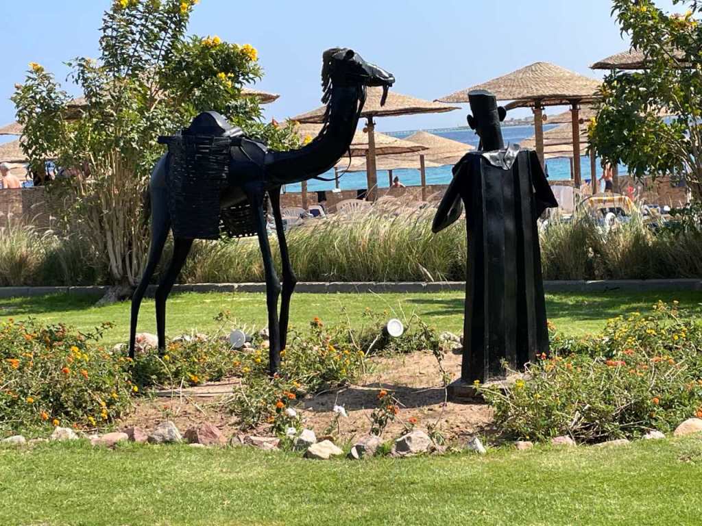Um die Mittagszeit wechseln wir zum Strand hinunter, hier stellen wir seit gestern Nachmittag ein Abnehmen der Urlaubsgäste fest. Heute Mittag sind nur noch etwa 50 Prozent der Sonnenschirme/Badeliegen belegt. Nach einer Stunde etwa haben wir unsere Strandschuhe angezogen, und sind in Richtung der Red Seas Hotels los gelaufen. Wir sind aber nicht weiter als zum Ende des Arabesque Hotels gekommen. Es war einfach heute etwas zu warm und Sauerstoffarm, ich konnte und wollte nicht mehr. Wir gehen zurück zu unserem Platz. Auch der Hurghada Express kommt mehrmals am Tag mit seinem Führer direkt am Wasser vorbei (der Hurghada Express ist ein Kamel mit seinem Führer, auf dem Kinder und auch Erwachsene am Strand reiten können, auch unser kleiner Enkel konnte bei seinem Aufenthalt vor zwei Jahren mit seinem Vater auf ihm Reiten.).
