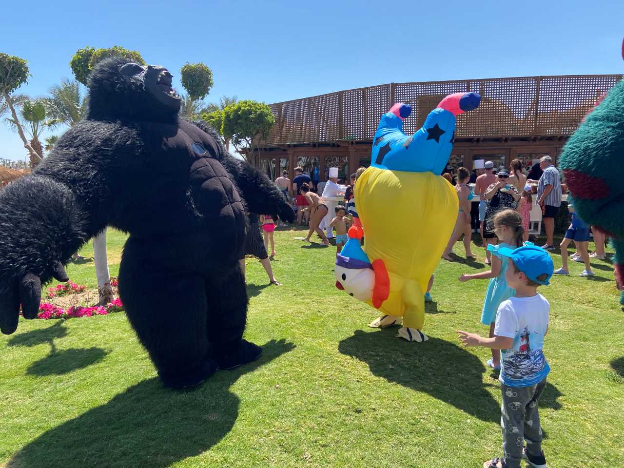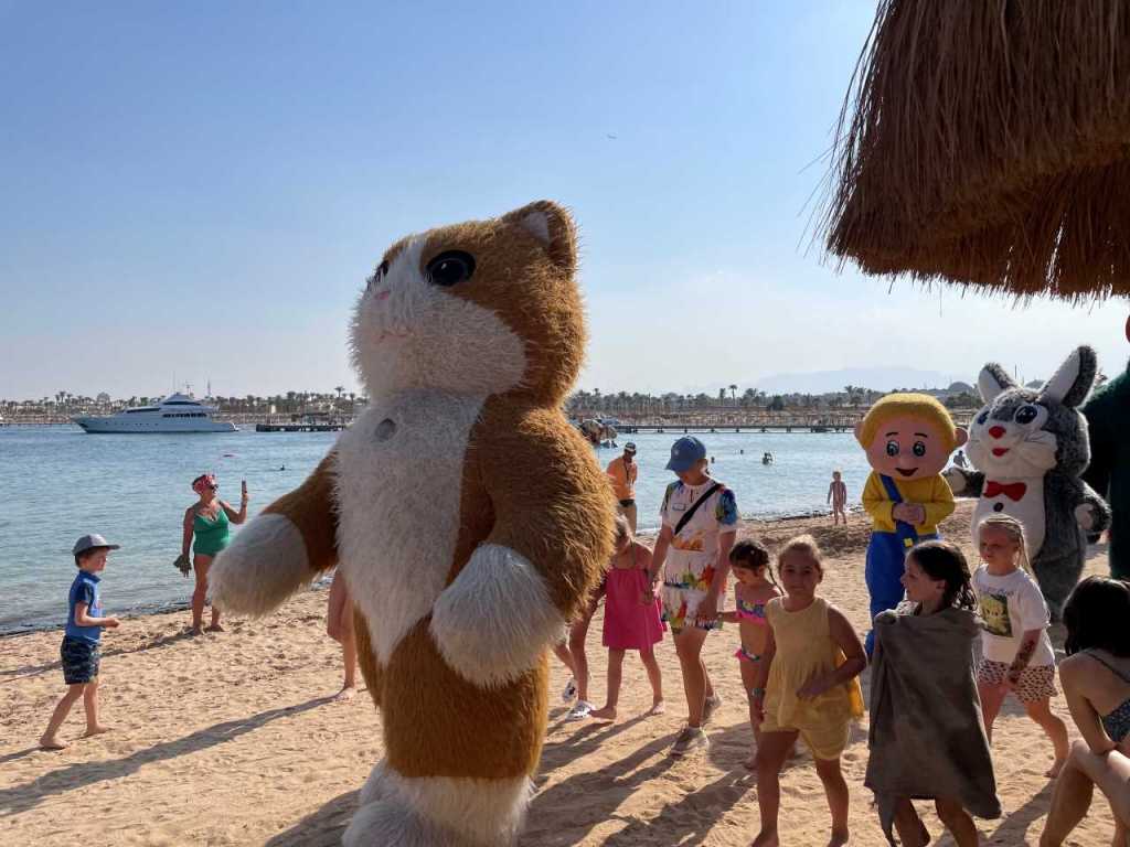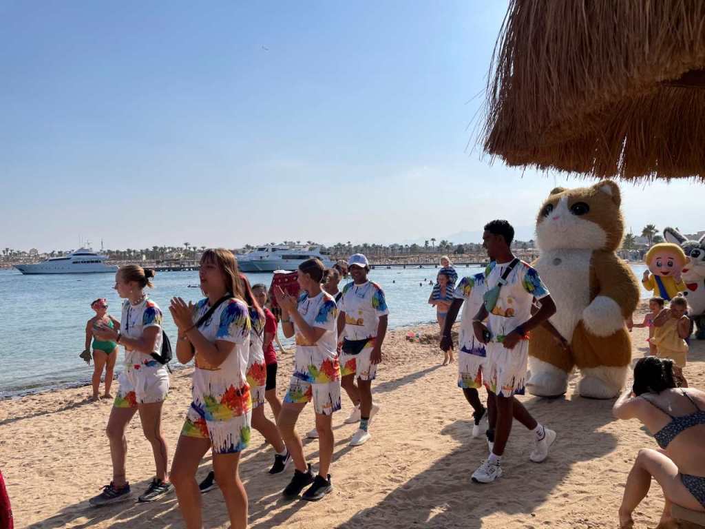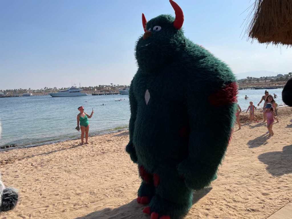 Gegen 11:00 packen wir unsere Badesachen zusammen und gehen zum Strand hinunter. In diesem Jahr sind anscheinend mehr Badegäste im Urlaub hier in den Sunrise Hotels. Dementsprechend sind freie Badeliegen bzw. Sonnenschirme schwer zu finden. Am Stand angekommen, sehen wir unsere Befürchtung bestätigt, es sind nur in der letzten Reihe direkt am Promenadenweg ein paar einzelne Badeliege bzw. Sonnenschirme frei. Auch heute sind wir direkt an der Chiringuito Bar (Beachbar), von wo der gesamte Strandabschnitt von Sunrise mit Getränken versorgt wird. Hier am Wegrand ist der Abstand der einzelnen Sonnenschirme noch etwas größer als am Wasser. Wir genießen die Ruhe und die warme Mittagssonne, gegen 12:30 ziehen wir unsere Strandschuhe an (meine jetzigen Strandschuhe habe ich letztes Jahr bei einem Spaziergang drüben im Makadi Palace gekauft). Heute wollen wir wieder auf die andere Seite der Bucht gehen, in Richtung des Jaz Makadina und des Makadi Beach Hotels. Wir kommen aber nicht weit, auf der Wiese wo die Gebäude von Sunrise Royal beginnen, und sich das Elia Restaurant und das Basilico Restaurant ist findet eine Veranstaltung statt. Hier haben die Köche und Bedienstete vom Sunrise Royal Schalen mit Obst und Snacks sowie Getränken aufgebaut. Wie man sieht Essen und Trinken umsonst geht bei den Urlaubern immer. Auch die Animateure sind in diversen Tierkostümen anwesend. Wir holen uns ein paar Stücke mit Ananas und geschnittene Orangen, und bleiben einige Minuten hier stehen.