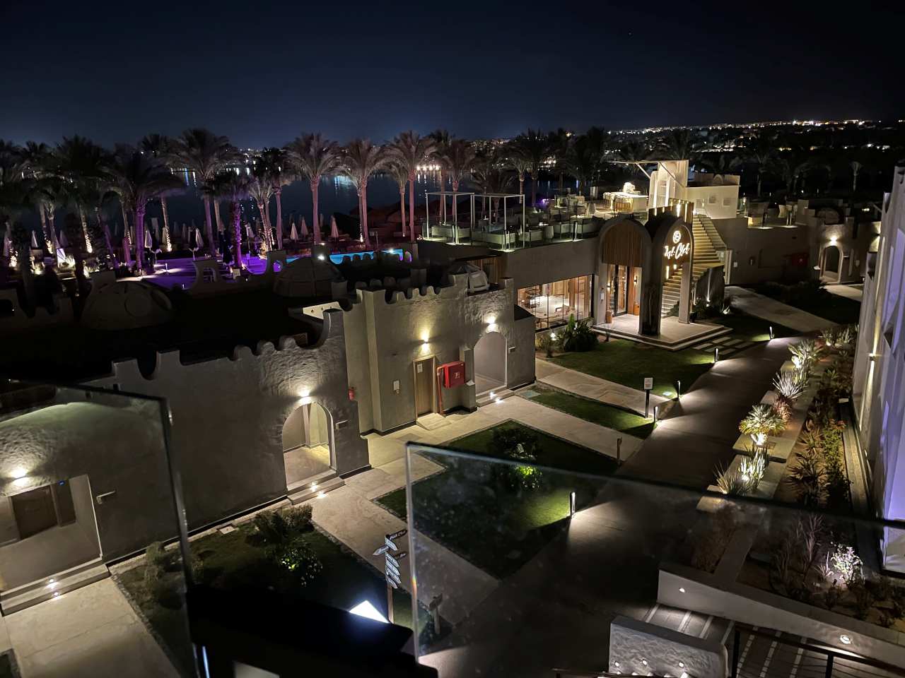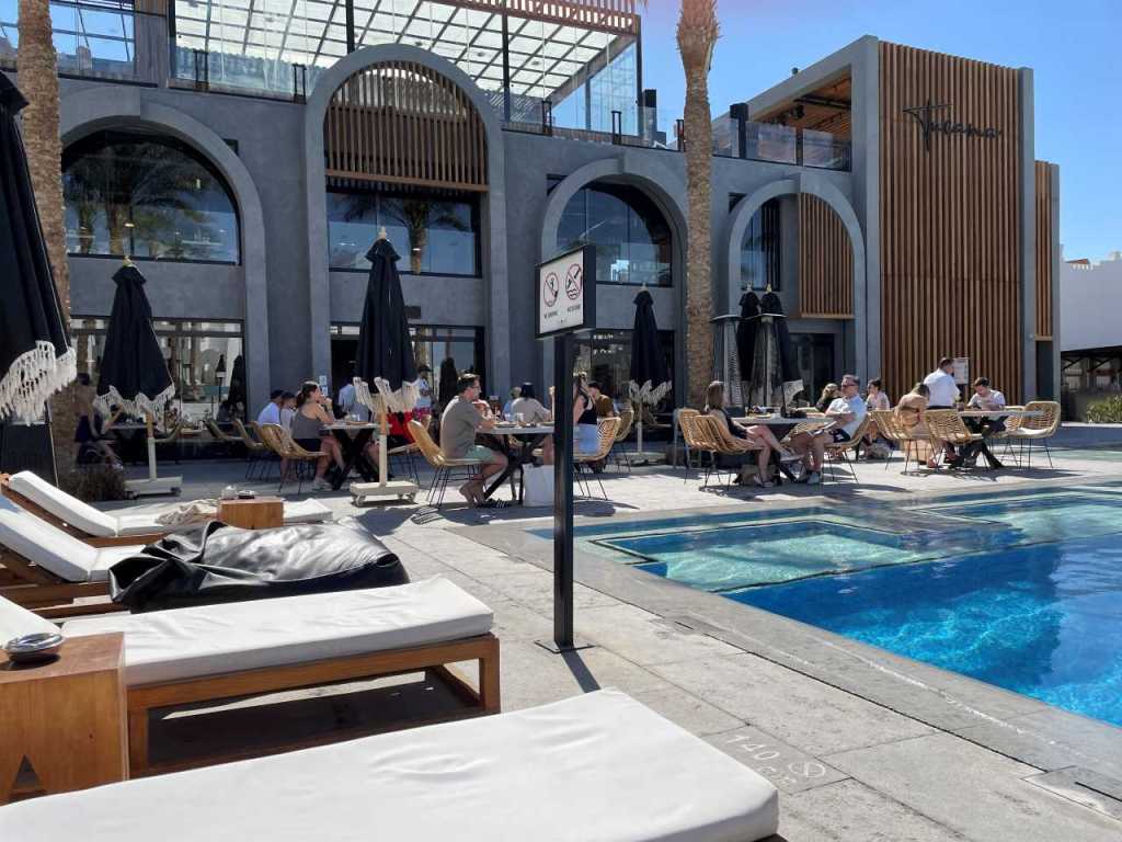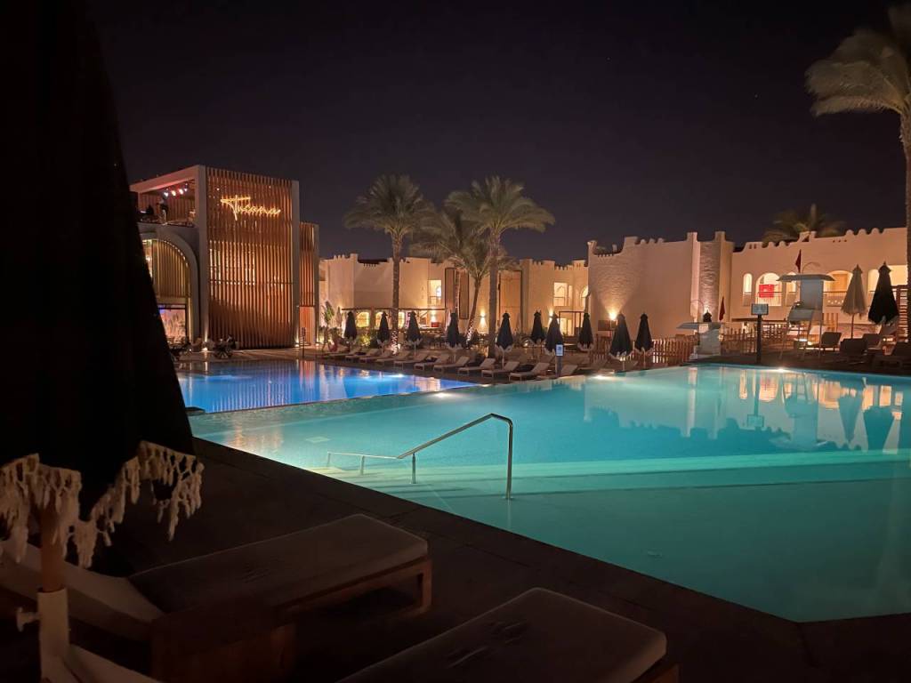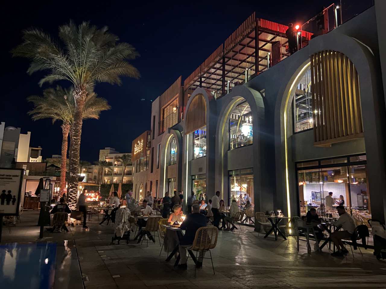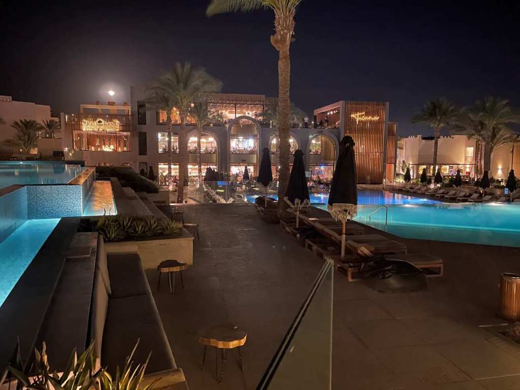 Wir kommen am großen Pool und der beleuchteten Anlage vom Posh Club vorbei. Im anschließenden Fellucca Restaurant (Fischrestaurant) sind auch heute keine Gäste. (Ich glaube aber, dass man hier Reservieren und das Fischessen auch bezahlen muss)