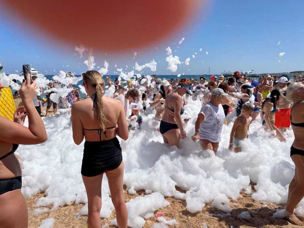 Am weitläufigen Strand des Hotel findet heute Nachmittag eine Schaumparty statt, wir gehen zu dieser Schaumkanone die in Nähe des Wassers aufgestellt ist, wo sich viele Besucher befinden. Es scheint ein großes Vergnügen für die Gäste zu sein, sich im Schaum zu bewegen.
