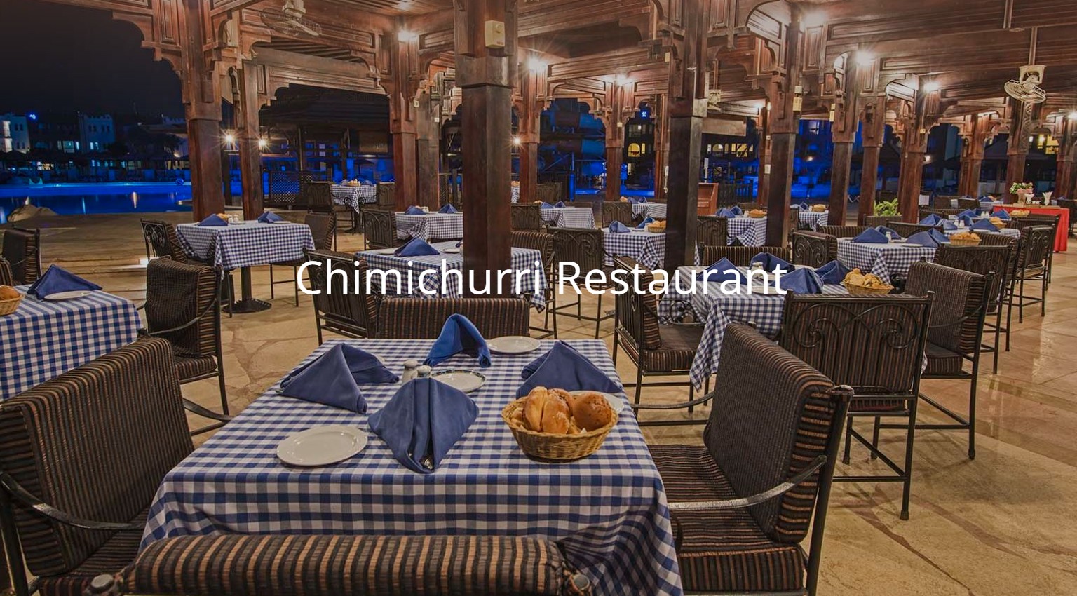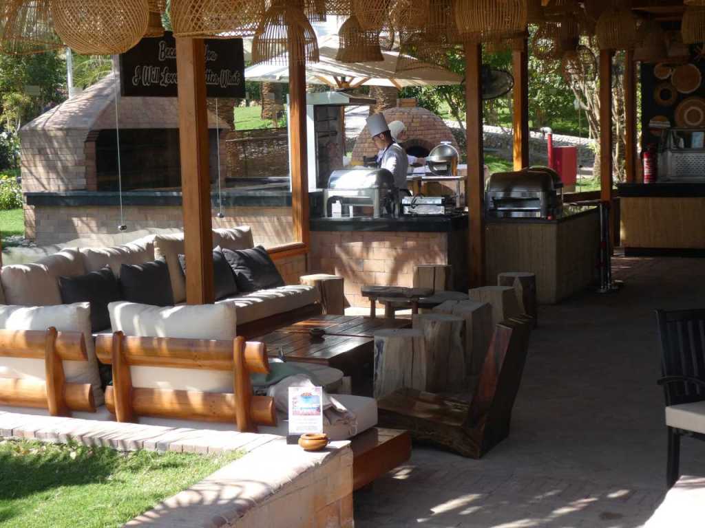 Um 15:00 sind wir zum Infinity-Pool hinauf gegangen. Beim Pool-Boy bestellen wir zwei Cappuccino`s, weil wir nicht in der Bar sitzen, kommen sie wohl in einem Pappbecher. Wir liegen das erste Mal hier oben unter den Markisen aus Holz, die wohl an die 15 Badeliegen beschatten. Neben uns liegt ein junges Pärchen mit einem paar Monate alten Baby. Etwas später werden zwei Badeliegen frei, so dass wir näher an den Infinity-Pool rücken. Irgendwann gehen wir nochmals zur Oasis-Bar hinunter um einen CubaLibre zu trinken. Wie meistens nach 17:30 gehen wir auf unser Zimmer zurück, um zu duschen und für den Abend fertig zu machen. Heute geht es ins Chimichurri Restaurant (Steakhaus). Es befindet sich an einem anderen Ende vom Sunrise Resort. Wir haben uns schon im letzten Jahr als wir hier waren den besten Weg dahin ausgesucht. Wie bei unseren sonstigen Spaziergängen gehen wir ins Sunrise Royal durch die große Rezeption, am vorderen Eingang wieder hinaus. Hier gehen wir rechts zum Kids Club und Kids-Playground weiter. Hier befindet sich ein weiterer großer Pool mit vielen großen Baderutschen. In der Nähe der Aqua Pool Bar befindet sich das Chimichurri Restaurant (Steakhaus).