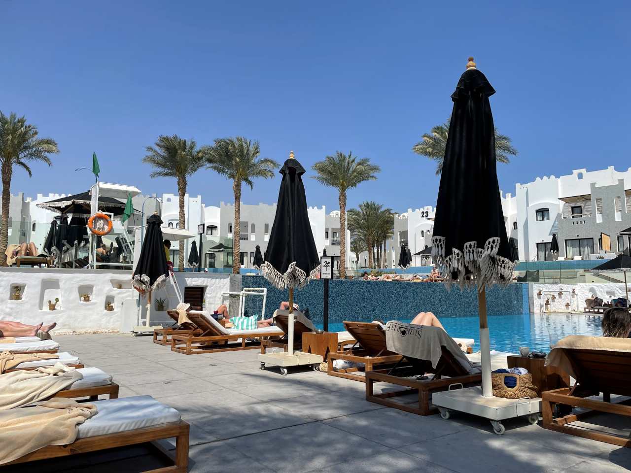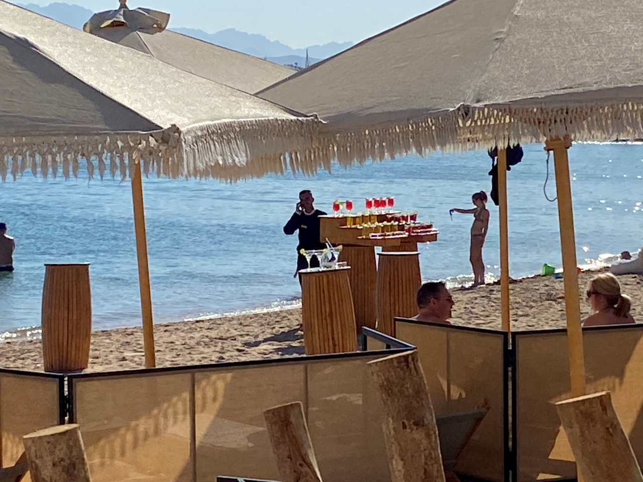 Nach dem Essen gehen wir wieder zurück zu unserem Sonnenschirm/Liege zurück. Die Sonne ist schon etwas weiter gezogen, so dass wir unsere Badeliegen aus dem Schatten der Sonnenschirme ziehen müssen, um weiter die warme Sonne zu genießen.