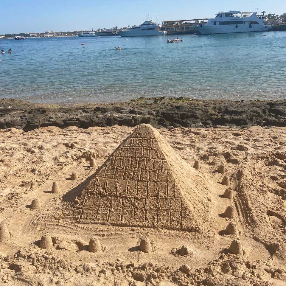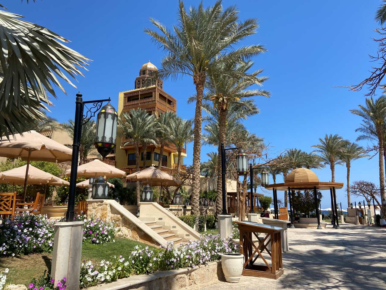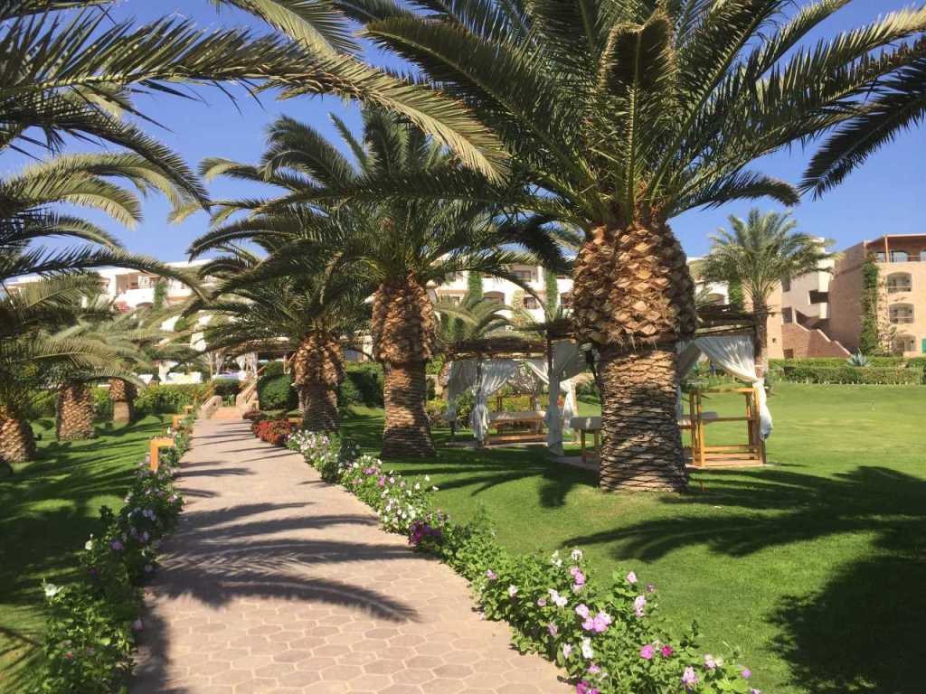 Wir bleiben bis etwa 12:30 hier am Oasis Pool, packen dann zusammen und gehen hinunter zum Strand, wo wir in der zweiten Sonnenschirmreihe einen netten Liegeplatz unter einem mit Stroh bedeckten Schirm finden. Nach einer weiteren halben Stunde ziehen wir unsere Strandschuhe an, um an der Uferpromenade entlang, in Richtung der Red Seas Hotels zu wandern. Unser nächstes Nachbarhotel ist das Fort Arabesque**** ein großes und hübsches Vier Sterne Hotel mit einen schönen Garten.