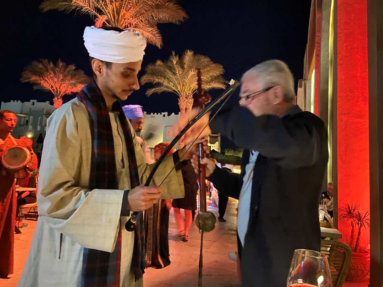 Der Unterhaltungsabend beginnt mit einer Gruppe Nubier mit ihren Musik-Instrumenten. Sie gehen an den Tischreihen entlang und fordern die Gäste auf mit Ihnen Musik zu machen. Sie drückten mir ebenfalls ein solches Streichinstrument in die Hand, um mit Ihnen zu Musizieren. Ein paar Minuten spielte ich Musik mit Ihnen. Danach gingen sie zum nächsten Tisch, um hier die Gäste ebenfalls dazu aufzufordern.