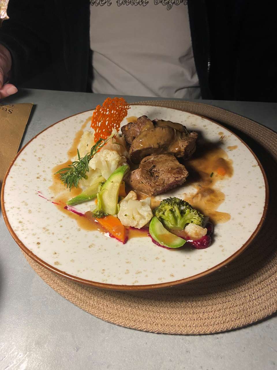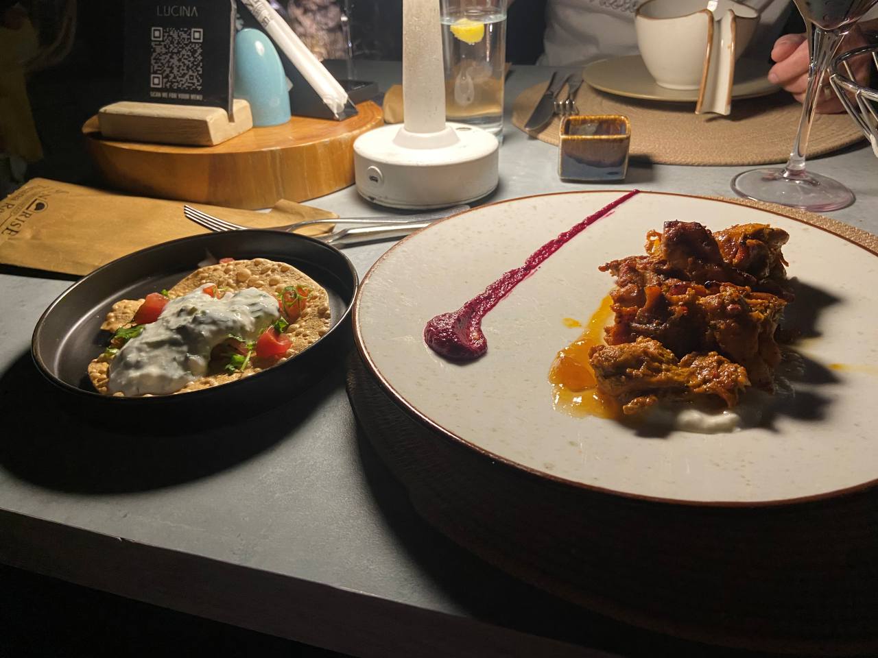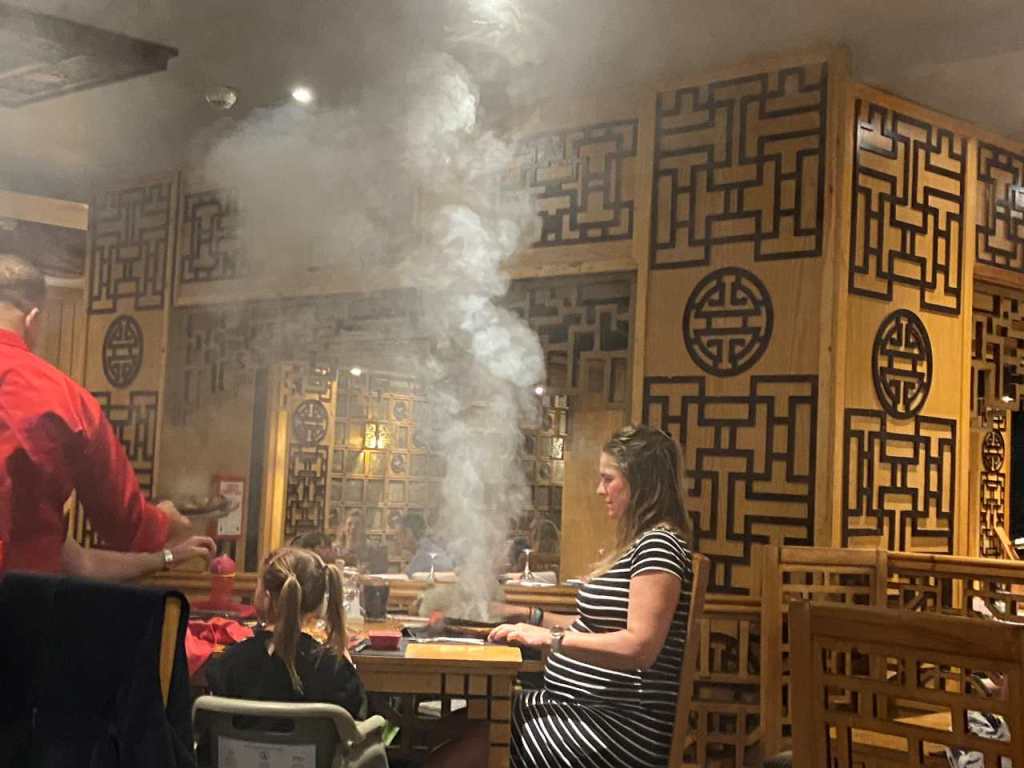 Wenige Minuten vor uns sind ebenfalls schon ein paar Gäste gekommen, sie werden in der Folge auch vor uns bedient. Als an einem der Nachbartische das bestellte Essen gekommen ist, stiegen zweimal Rauch oder Dampfwolken bei ihnen auf, wir können natürlich nicht erkennen, was sie zum Essen bestellt hatten.