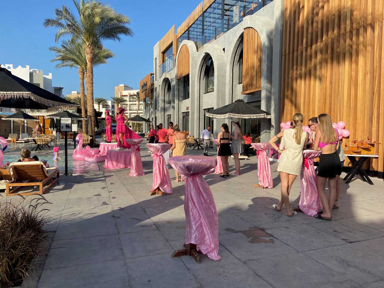 Ich mache noch ein Bild von zwei der kostümierten Animateuren. Anschließend packen wir unsere Badesachen zusammen und machen uns auf den Weg nach oben zum Pool bzw zur Oasis-Bar. Wir kommen an den Posh Villen vorbei, es gibt sie in den Zimmergrößen von 36 qm bis 250 qm.