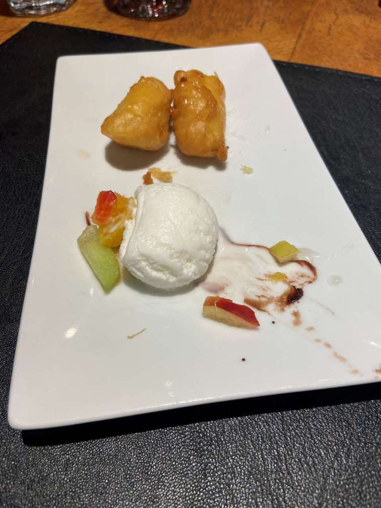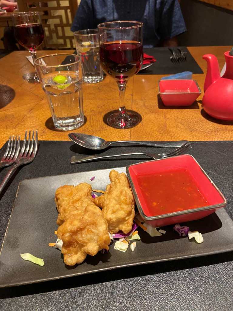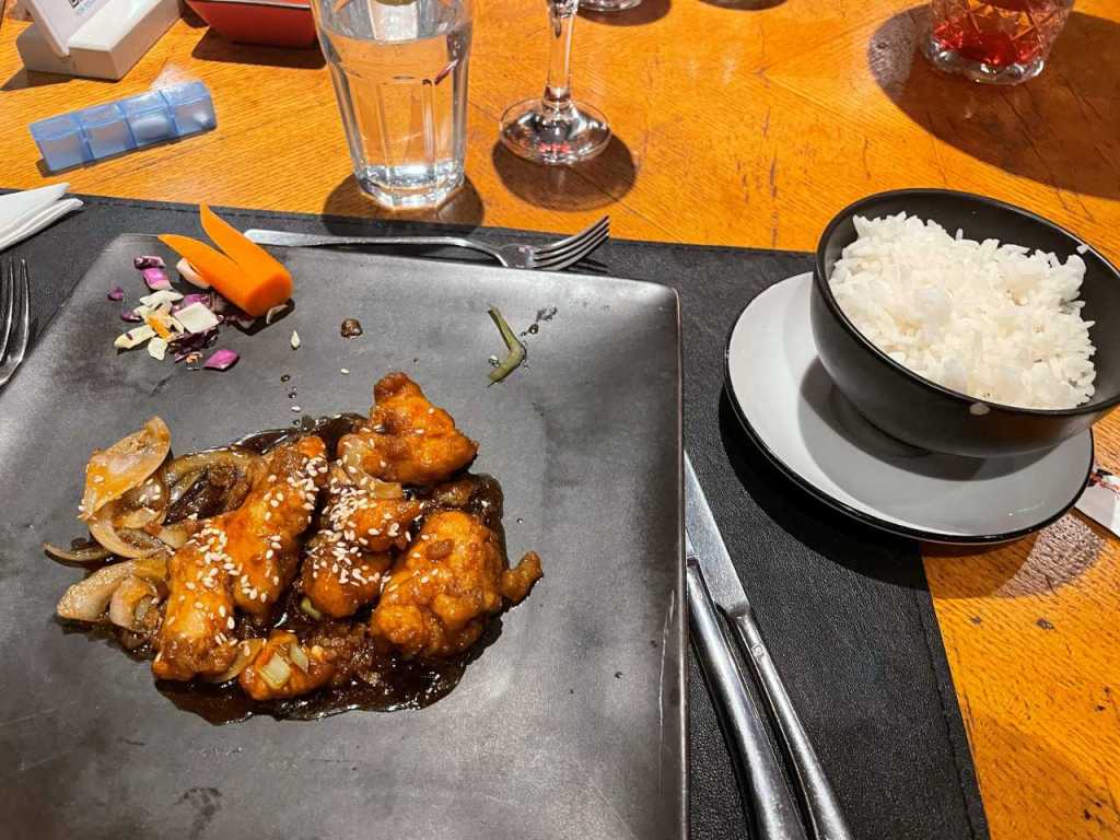 Der nette Kellner bringt uns eine Speisekarte zur Auswahl vorbei, nach kurzer Zeit kommt er wieder an unseren Tisch um unsere Bestellung aufzunehmen. Zum Trinken bestellen wir ein Glas Rotwein sowie ein Glas mit Wasser, Was wir im einzelnen gegessen haben, weiß ich nicht mehr so ganz genau. Ich bestellte eine Tomatensuppe mit Ei, danach gibt es Hähnchen Süßsauer mit Honig und Pilzen und Zwiebel. Meine Frau bestellte ein Frittiertes Hähnchen mit Chilly Dip, als zweiten Gang nahm sie eine Asiatische Ente mit gebratenen Nudeln. Zum Abschluss bestellte sich meine Frau eine Frittierte Banane auf Vanillie-Eis. Ich nahm zum Abschluss eine Schale mit gemischtem Eis.