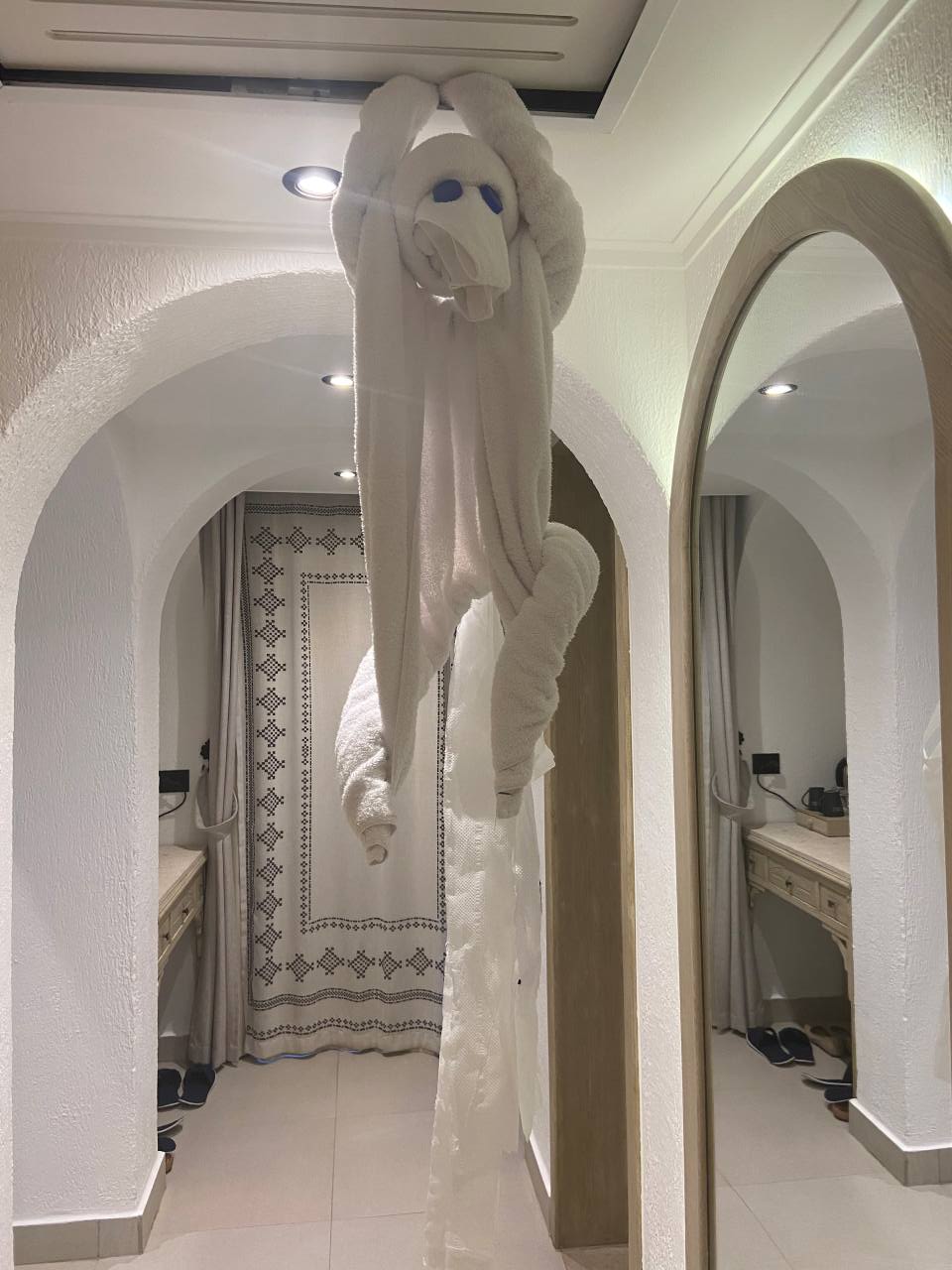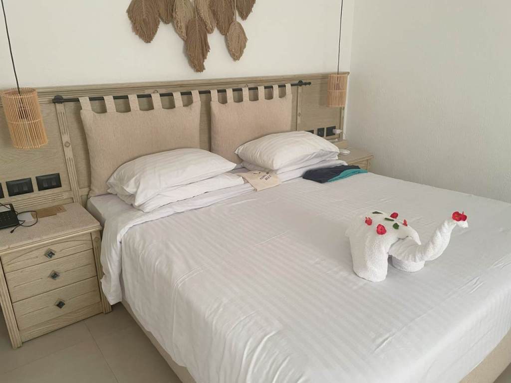 Nach einer halben Stunde brechen wir wieder auf, zurück zu unserer Sonnenliege. Einige Zeit später kam der Strandboy den wir vom letzten Jahr noch gut kannten, und fragte uns ob er etwas zu Trinken vorbei bringen könnte. Wir kommen ins Gespräch mit ihm, er stammt aus Luxor wohnt aber jetzt mit seiner Familie in Hurghada erzählt er uns. Jeden Abend nach Feierabend fährt er zu seiner Familie zurück. Das ist für uns kaum vorstellbar, weil ja keiner der Bediensteten hier ein Auto besitzt. Aber vielleicht gibt es ja Busse, die spät am Abend und sehr früh am Morgen diesen Transfer machen. Gegen 16:30 haben wir unsere Badesachen gepackt, und sind an den Posh-Villen vorbei zur Oasis-Bar hinaufgegangen. Bei unserem jungen Kellner bestellen wir zwei Tassen Cappuccino, die wir gemütlich trinken, bevor wir nochmals eine Treppe höher zum Infinity-Pool gehen. Auch hier sind alle Badeliegen belegt, aber es gibt hier noch Sitz oder Liegekissen, die wir in die Sonne ziehen. Als die Abendsonne hinter den Häusern vom Sunrise Royal verschwindet, brechen wir auf, und gehen in unser Zimmer zurück. Hier werden wir auch schon erwartet, unser Zimmerboy hat uns ein Strandtier auf`s Bett gelegt.