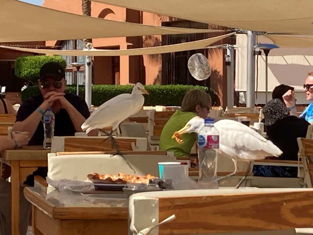 In diesem Jahr haben wir auch einen Reiher (Kuhreiher ?) hier im Tucana Resort, der zu den Essenszeiten an den Tischen auf der Terrasse auftaucht. Im Sunrise Royal am Splash Imbiss haben wir sie ja schon im letzten Jahr gesehen. Es ist Interessant ihm beim Laufen nach zu schauen, Schritt für Schritt geht er voran, jederzeit bereit auch einen Schritt wieder rückwärts zu machen. Im Anschluss an unser Frühstück suchen wir uns ein Plätzchen am Pool. Beim Kellner von der Oasis-Bar bestelle ich einen Strawberry Juice (Erdbeersaft) der vorzüglich schmeckt, meine Frau trinkt ein Tonic Water.