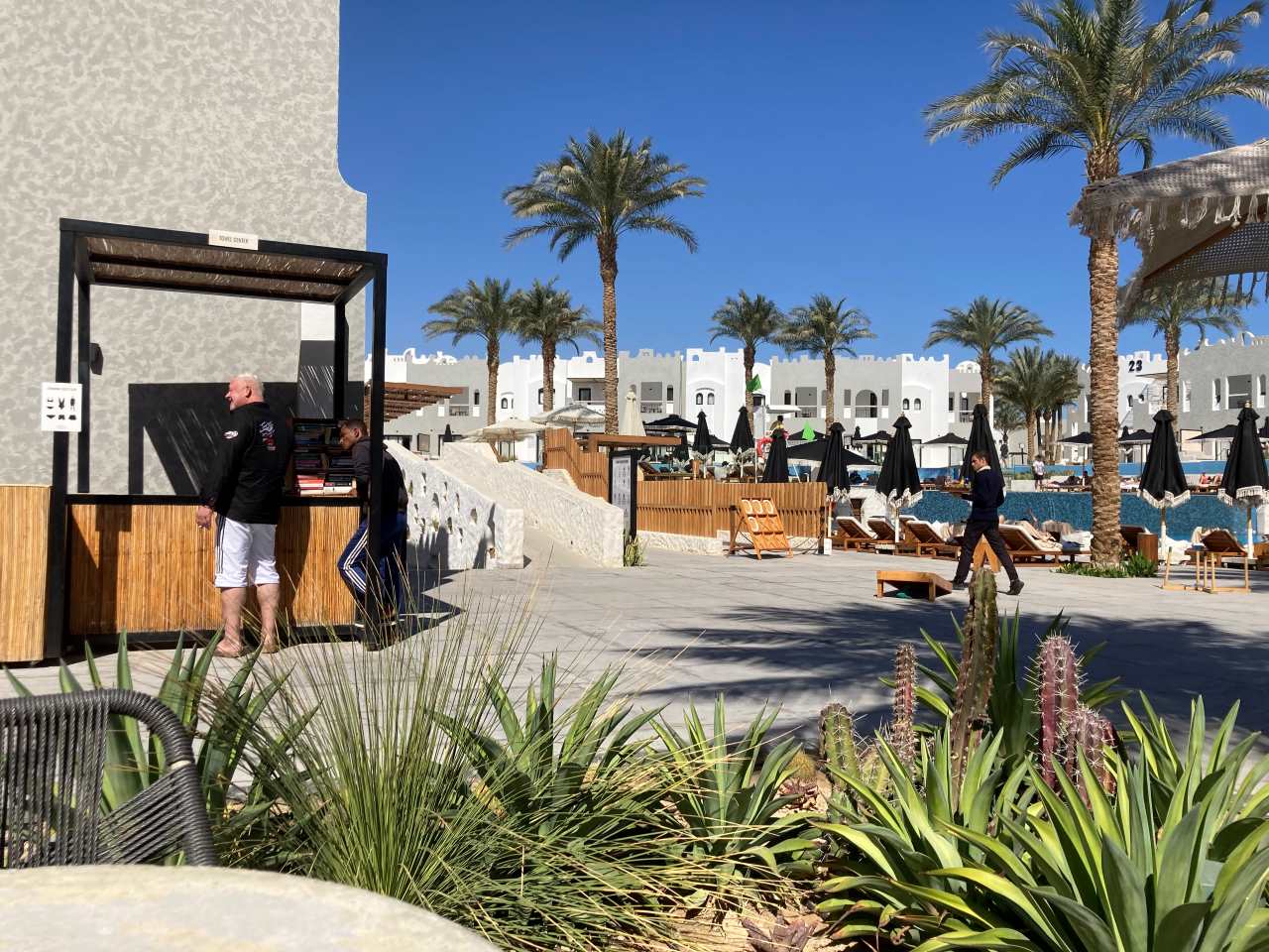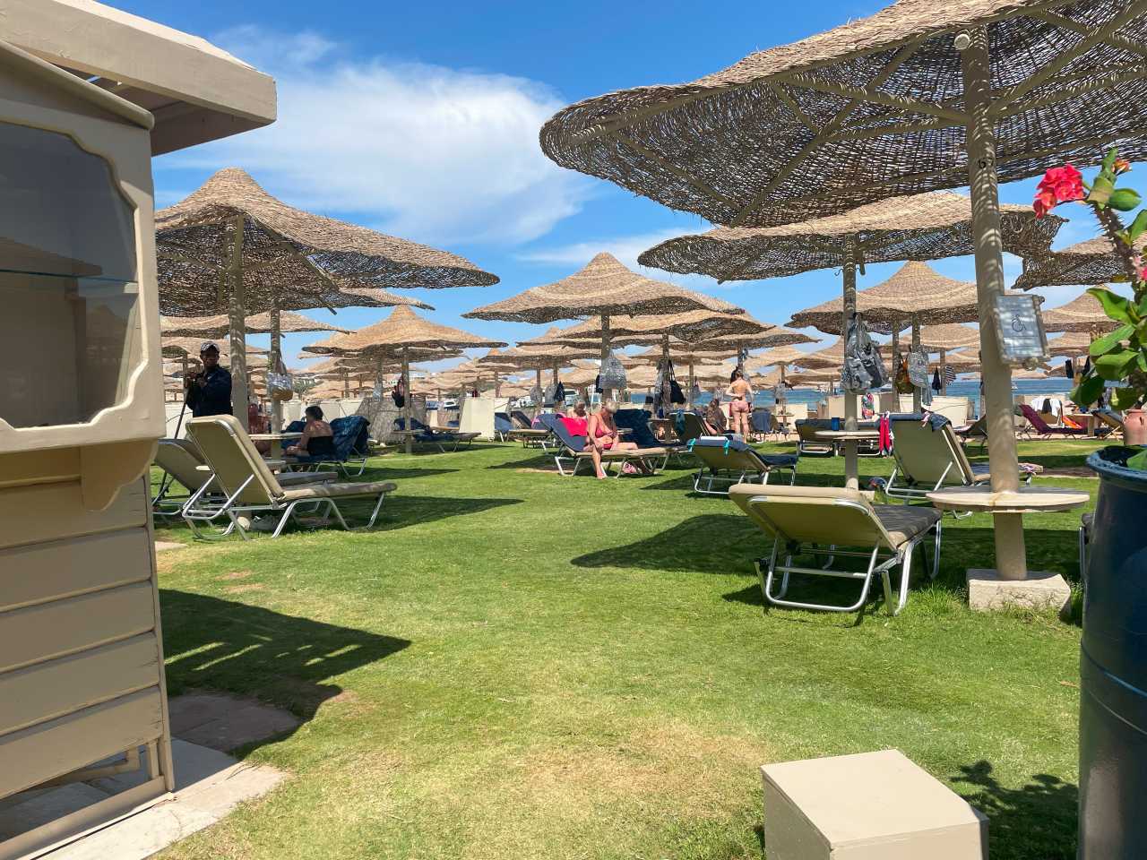 Auf einer Bank vom Jaz Makadi Blue-Tui setzen wir uns hin, sie haben hier im Strandbereich sogar eine Rasenfläche statt der Sandfläche gemacht. An einer Hütte hängt sogar ein kleiner Bücherschrank für die Gäste.