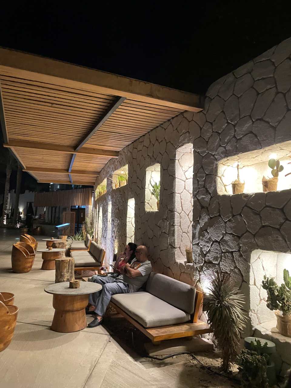 Wir haben danach in der Rezeption zwei weitere Restaurant Besuche im Sunrise Royal Makadi gebucht. Für den Montag Abend hier im Gaia-Restaurant (Italienische Küche) ein Stockwerk höher, und am Mittwoch wollen wir in das Manzouku Restaurant (Asiatische Küche) gehen. Das Chimichurri Restaurant (Steakhouse) können wir heute nicht mehr vorbestellen. Wir gehen anschließend weiter in unser Zimmer um zu Duschen und uns kurz frisch machen. Danach gehen wir zum Abendessen ins Lucina-Restaurant hinunter. Der Weg ist eigentlich sehr kurz, wir verlassen unser Haus gehen kurz nach rechts, eine kleine Treppe zwischen der Cohiba-Bar und den angrenzenden Souvenir-Geschäften nach unten. Danach ein paar Meter an den Geschäften vorbei und wir stehen schon am Willkommensbereich vor der Rezeption. Auf der rechten Seite ist eine schöne Mauer die mit Steinen und Kakteen in den vielen Mauernischen im Mexikanischen Stil dekoriert ist.