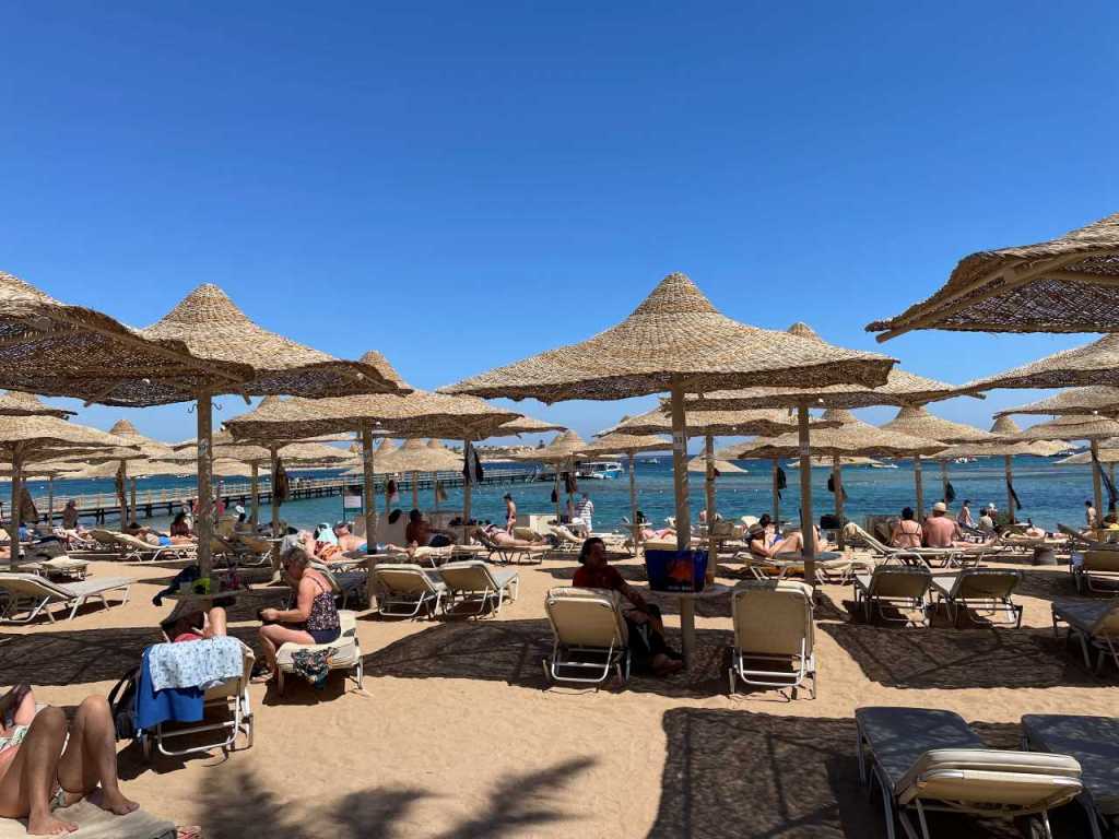 Viele der Badeliegen am Poolbereich sind schon vor dem Frühstück mit Handtüchern belegt. Das gleiche passiert am Strand, ab 11:00 bekommt man keine freien Sonnenschirme und Badeliegen in den ersten drei Reihen. Mit Glück gibt es dann noch in der letzten Reihe einzelne Plätze. Die Besucherzahlen in diesem Jahr scheinen etwas höher zu sein, als im vergangenen Jahr. Es betrifft aber eher die zwei Sunrise Hotels, auch die Red Seas Hotels scheinen mehr Gäste als im vergangenen Jahr zu haben. Dagegen die Hotels von Jaz Makadi in der inneren Bucht sind nicht gerade überlaufen.