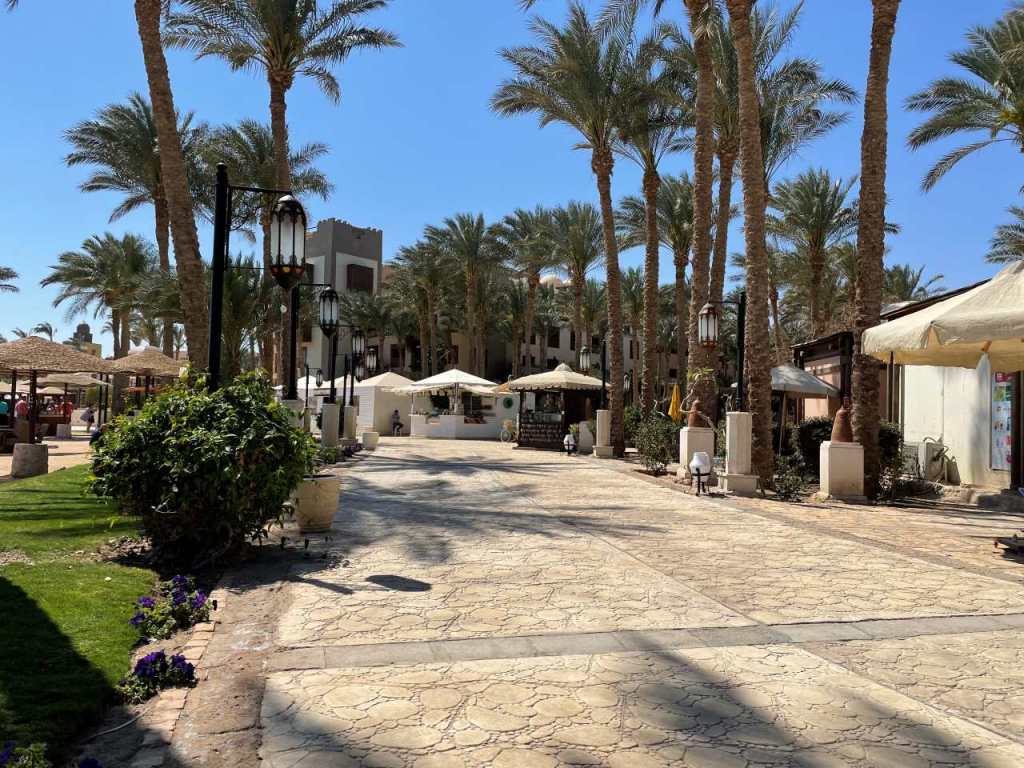 Wir gehen am Aquarius Diver Club (Tauchzentrum) vorbei, bis wir die schöne mit Pflastersteinen geschmückte Promenade von den Red Sea Hotels erreichen. Auf unserer rechten Seite beginnt das große Strandareal mit Hunderten von Badeliegen und Sonnenschirmen, die für die Gäste der oben genannten Hotels zu Verfügung stehen. Auf der linken Seite befinden sich das Gebäude von Grand Waterworld Makadi, hier gehen wir eine Außentreppe nach oben, um uns die großen Pools der Sunwing Waterworld anzuschauen. Danach gehen wir weiter am Biergarten (hier gibt es deutsche Küche mit Würstchen und mehr) und am La Terraza Restaurant vorbei. Wir gehen am Infinity Pool des The Makadi Spa vorbei, bis wir an der riesigen Gartenfläche des The Makadi Palace ankommen. Was mir hier besonders gut gefällt, es stehen immer Gruppen von 4 bis 5 Palmen beieinander, das gibt ein tolles Bild. In anderen Hotels stehen die Palmen nacheinander in langen Reihen. Auf einer der vielen Sitzbänke nehmen wir Platz, gegenüber sind einige Kiosk wo es Souvenirs und Gewürze und anderes mehr gibt. Letztes Jahr als wir hier auf der Bank saßen, konnten wir gegenüber ein paar Frauen in einem Fish-Spa beobachten, wie Sie gackerten und schwatzten.