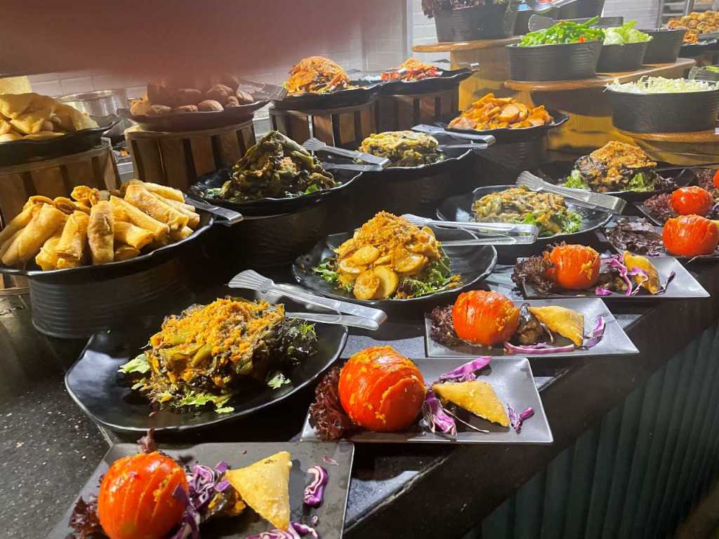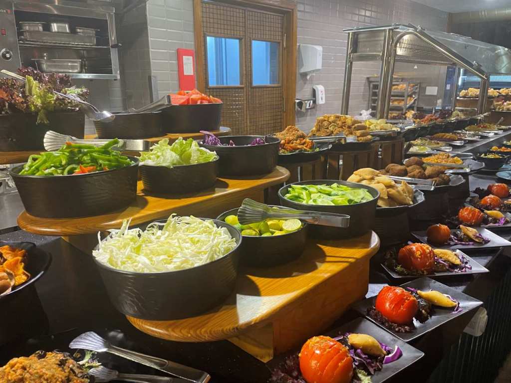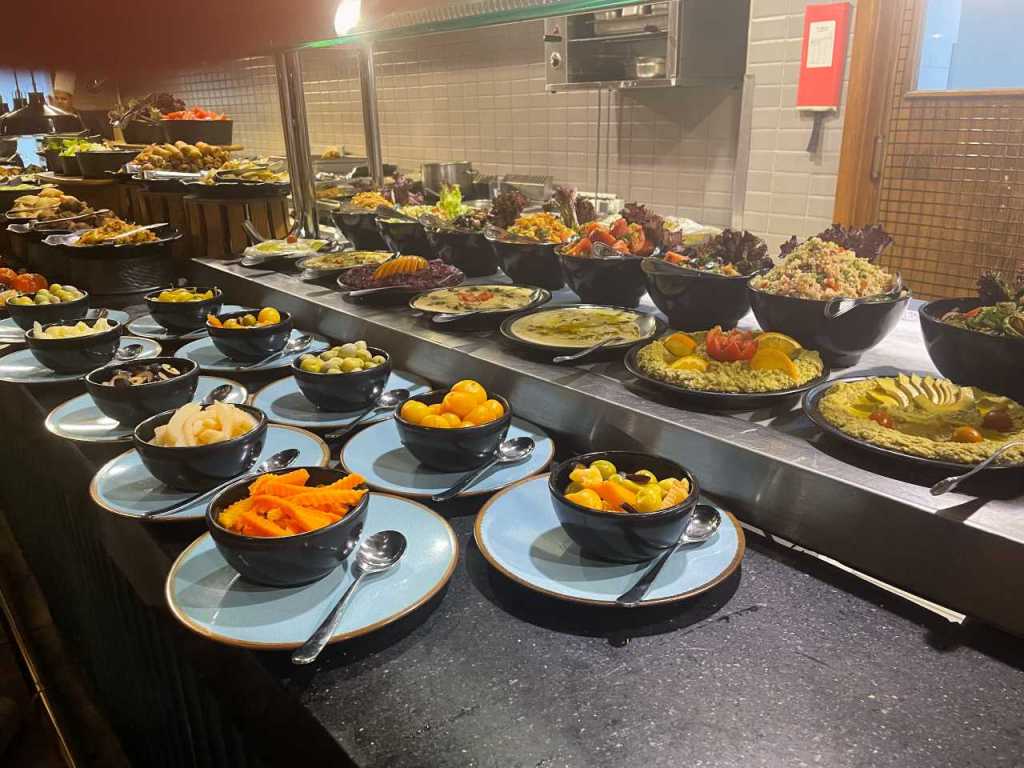 Wie wir schon heute Morgen von unserer Empfangsdame erfahren haben, findet heute ein Arabischer Abend statt, mit Essen vom Grill, alle möglichen Beilagen sind auf der Terrasse in großen Schüsseln und Behältern untergebracht. Ich habe keine Fotos von all den Köstlichkeiten die in den großen Töpfen verborgen sind. Unter anderem liegt ein Truthahn auf einer Wärmeplatte. Salate und mehr sind als weiteres Buffet im Lucina Restaurant aufgebaut, hier konnte ich in aller Ruhe ein paar Fotos machen. Wir haben uns schon zuvor Sitzplätze vor dem Lucina Restaurant gesichert.