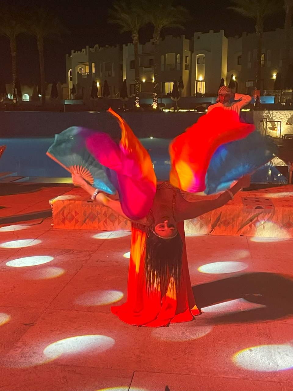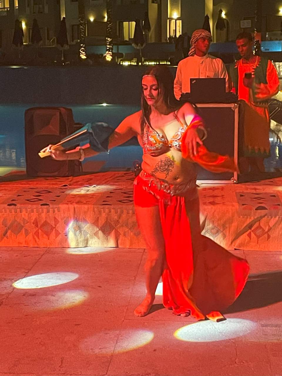 Im Anschluss kommt eine hübsche junge Ägypterin und zeigt uns einen typischen Arabischen/Ägyptischen Bauchtanz in zwei verschiedenen Tänzen.