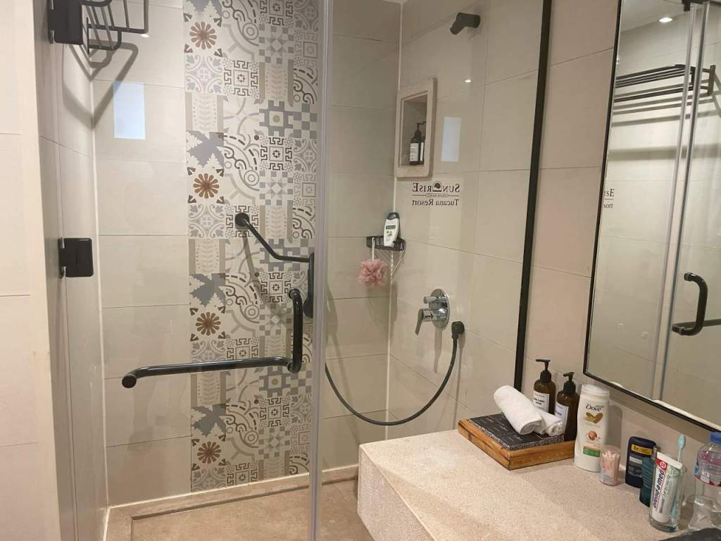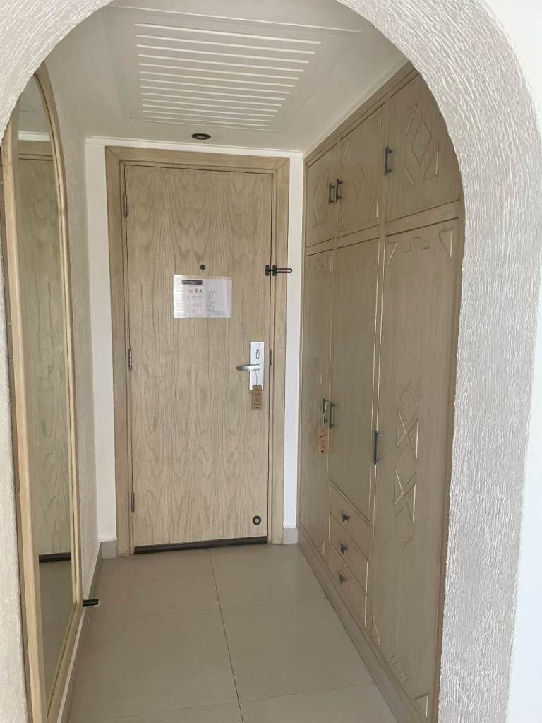 Gegen 17:00 verlassen wir den Strand und gehen hinauf zur Oasis-Bar, wo unser junger Bar-Kellner auf uns wartet. Bei ihm bestellen wir zwei Tassen Cappuccino. Anschließend gehen wir noch kurz auf die obere Poolebene, hier finden wir freie Sitzkissen, wo wir uns setzen. Wir gehen heute Abend etwas früher in unser Zimmer zurück, um uns für den Heutigen Abend fertig zu machen. Wir wollen im Manzouku Restaurant (Asiatisch) essen, am Samstag hatten wir in der Rezeption für heute einen Tisch reserviert. Während meine Frau zum Duschen geht, mache ich noch ein paar Bilder von unserem Zimmer.