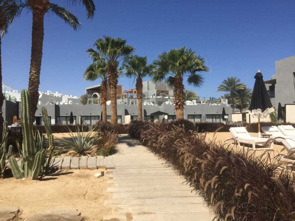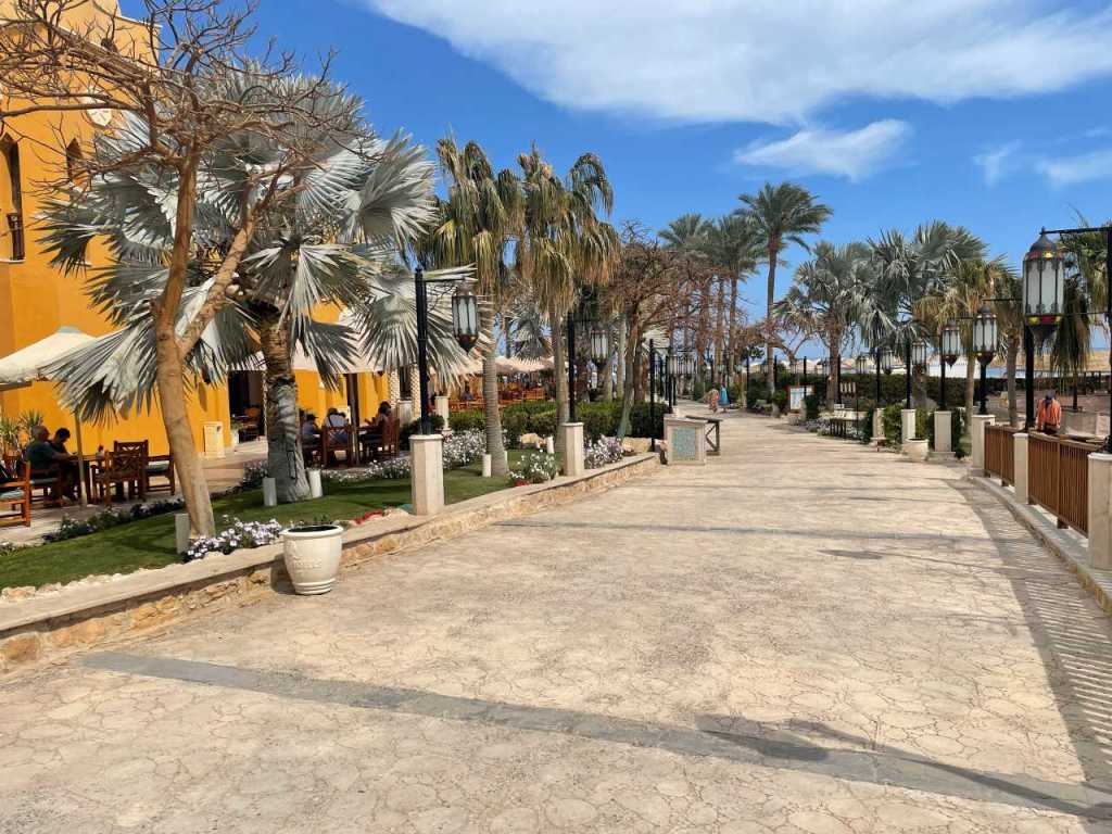 Vorbei am Eingangsbereich vom Makadi Spa Hotel folgen wir dem Promenadenweg zwischen dem Spa Hotel und der Sunwing Waterworld. Er mündet beim Restaurant La Terraza wieder in die Hauptpromenade die alle Red Sea Hotels auf der Strandseite miteinander verbindet.