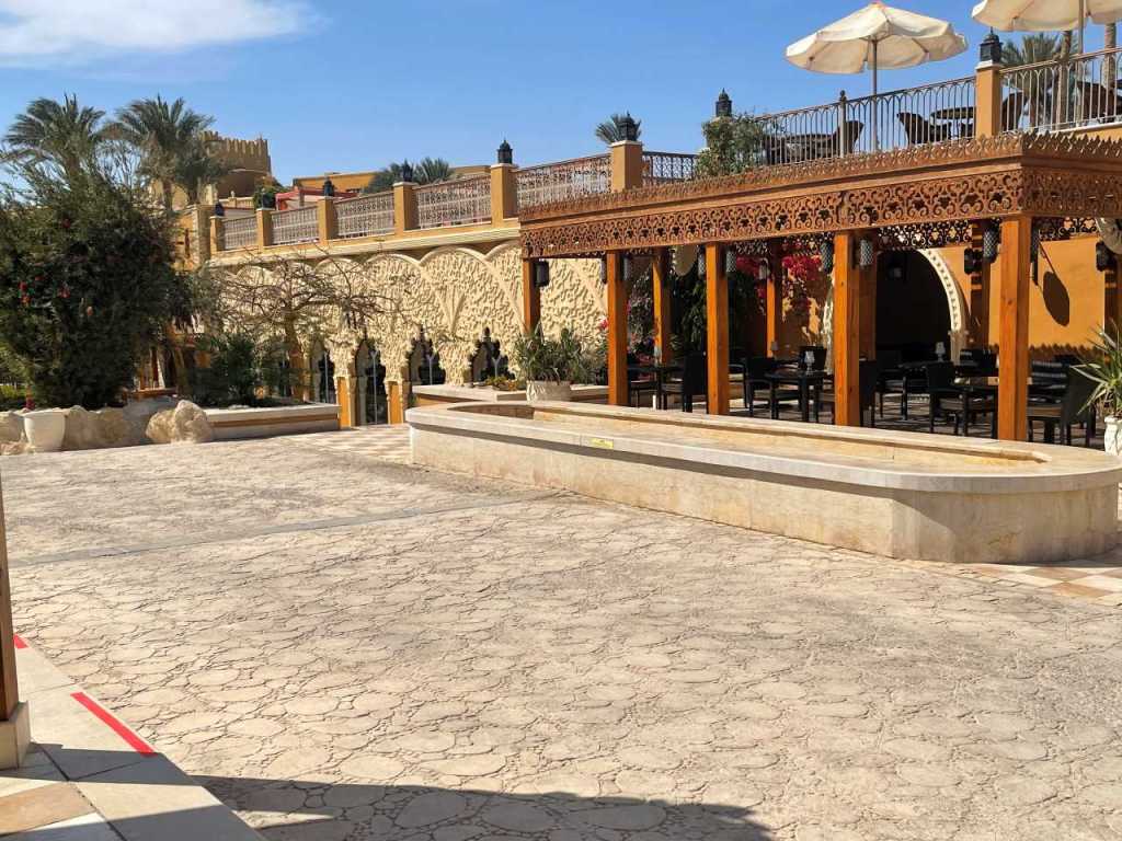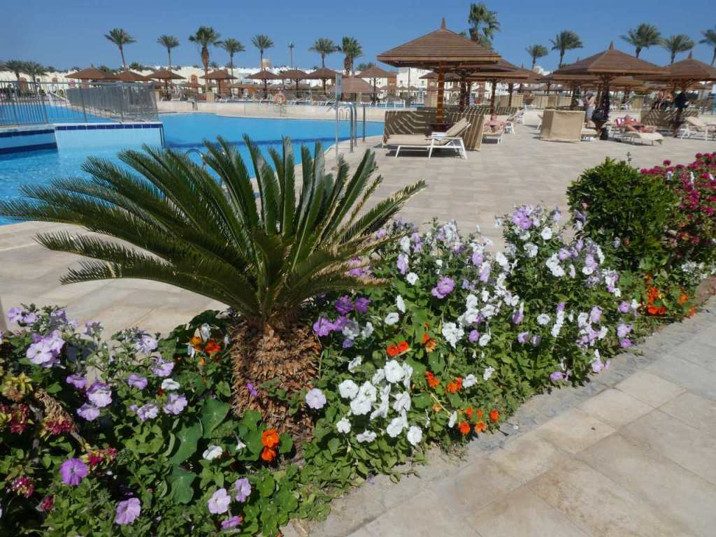 Jetzt haben wir das Madinat Makadi erreicht, es ist die Keimzelle des Madinates und besteht aus 9 verschiedenen Hotels, die aber offensichtlich heute fast alle zur Jaz Hotel Gruppe gehören. Als erstes kommen wir am Jaz Makadina vorbei, unser ehemaliges Sol Y Mar Club Makadi. Auf den ersten Blick scheint es wenig verändert, bis auf das kleine Theater, das abgerissen wurde. Letztes Jahr haben wir nochmals einen Spaziergang auf das Hotelgelände mit seinem hübschen Garten gemacht. Heute gehen wir weiter bis zum Iberhotel Makadi Beach wo wir bis zum großen Pool hinein gehen.