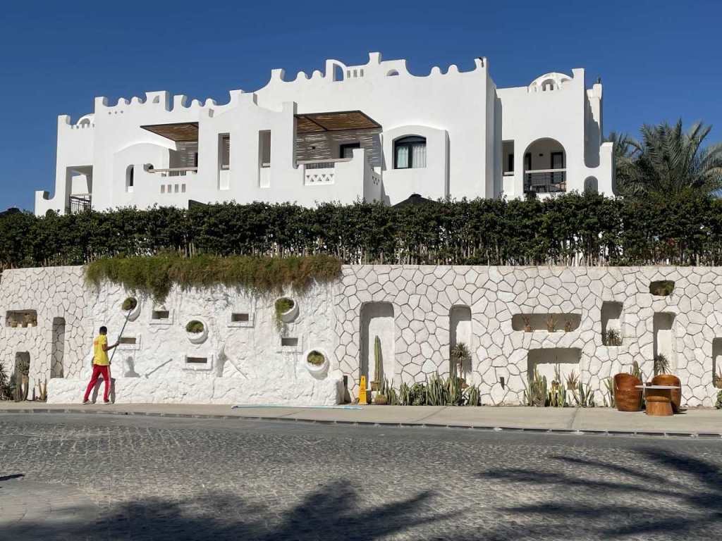 Wir gehen los, das nächste Hotel in diese Richtung ist das Xanadu Makadi Bay mit einem sehr großen Strandabschnitt. Das Hotel hat wohl auch eine große Grundstücks-tiefe, denn seine Gäste werden mit einem Elektro-Car vom Strand bis in die einzelnen Wohn-Bereiche gebracht. Letztes Jahr wollte ich einen Besuch, in das Xanadu Makadi Bay Gelände machen. Am Beginn einer Straße die zu den einzelnen Häuserblöcken führt steht ein Security Mann der einen unberechtigten Besuch unterbindet. Auch in diesem Jahr steht ein Security Mann an der Einmündung, und passt genau auf, dass keine Fremden Gäste das Gelände betreten. Wie man von der Strandpromenade erkennen kann ist das Xanadu Hotel sehr Modern gehalten.