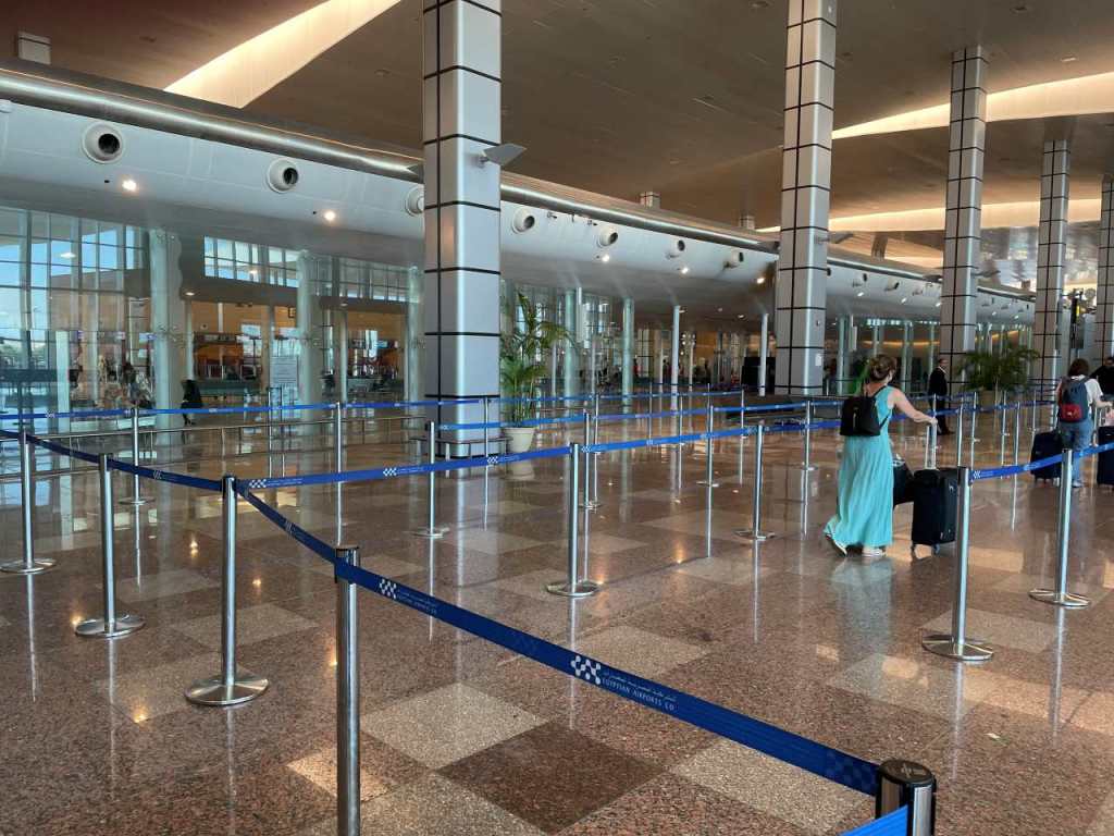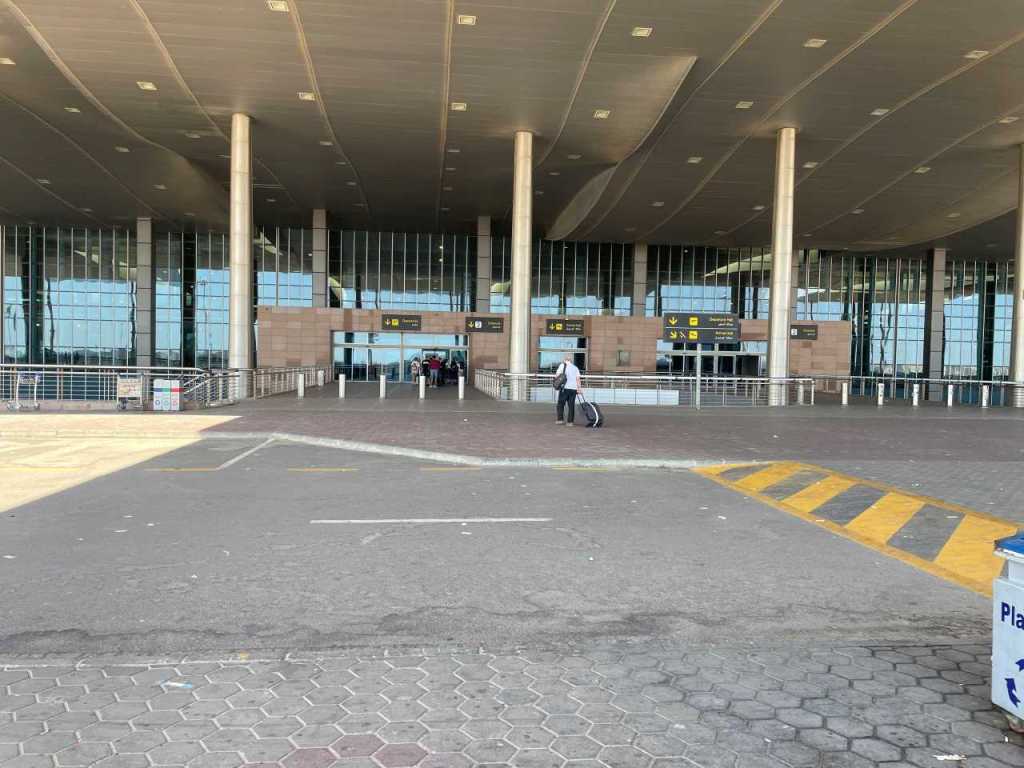 Da klingelt auch schon unser Handy, eine WhatsApp von unserem My Drive Fahrer, er steht vor dem Eingangstor des Hotels. Wir müssen jetzt in der Rezeption seine Einfahrt und das Autokennzeichen bestätigen, erst dann wird die Eingangsschranke für Ihn geöffnet. Wenige Minuten später ist er hier, die Zeit es ist 9:45 geworden. Unsere Koffer sind im Nu eingeladen, und schon kann es los gehen. Bis zum Flughafen von Hurghada sind es ca. 37 Kilometer, wir brauchen dafür eine knappe halbe Stunde. Wir müssen zum neuen Terminal 1, wir fahren eine lange Rampe zur Abflugebene hinauf. Hier lässt uns der Fahrer aussteigen, wir bezahlen für diese Fahrt 18 Euro.