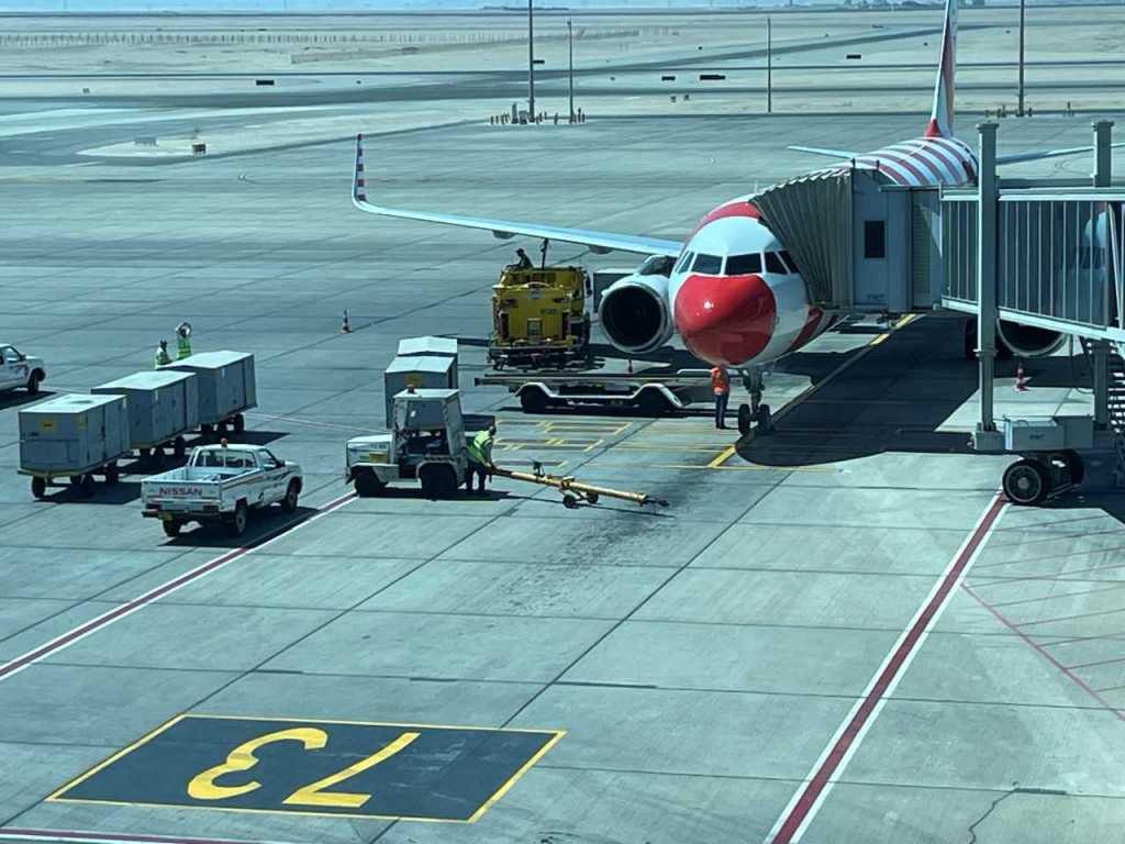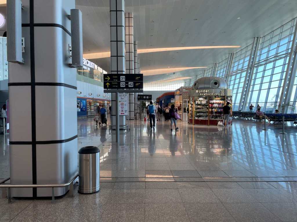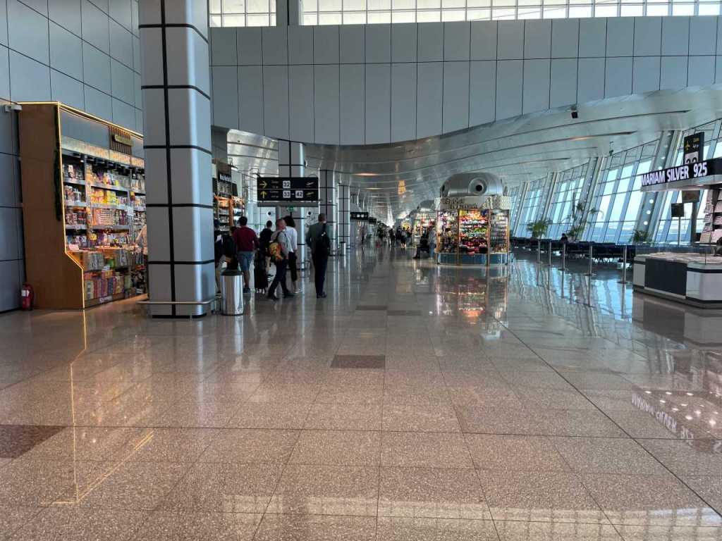 Danach geht es in die riesige Halle, wo wir zum Flug einchecken und unsere Koffer abgeben. Wir haben leider vergessen nach Fensterplätzen zu fragen, so bekommen wir beide Sitzplätze am Mittelgang, aber die vier Stunden oder etwas mehr wird es schon gehen. Danach geht es weiter zu den Gates wir müssen auf Gate 39, wie es sich herausstellt ist das fast am Ende der großen und modernen Abflughalle. Wir sind 10 Jahre lang von diesem Flughafen geflogen, das im Aussehen einem Beduinenzelt entsprach. Es gab viele Souvenier-Geschäfte in der damaligen Halle, es entsprach eher einem Basar als einem Terminal. Es hatte durchaus seinen Reiz, ob die neue Halle seine Besucher anspricht bleibt jedem Betrachter selbst überlassen. Auch im letzten Jahr hat der Abflugbereich noch vollkommen anders ausgeschaut.