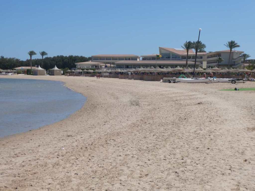 Gleich dahinter befindet sich der Strand vom Prima Life Hotel**** ebenfalls ein Vier Sterne Haus. Das wir schon bei unserem ersten Aufenthalt in der Makadi Bay im Jahr 2009 gesehen haben, das mir aber schon damals nicht besonders gefallen hat. Wir gehen bis zu einer Absperrung dahinter geht es weiter zu den Red Seas Hotels, hier drehen wir wieder um. Es ist mittlerweile schon ziemlich warm geworden, wir sind heute vielleicht auch etwas zu spät um einen Strand-Spaziergang zu machen.